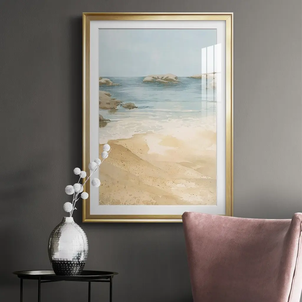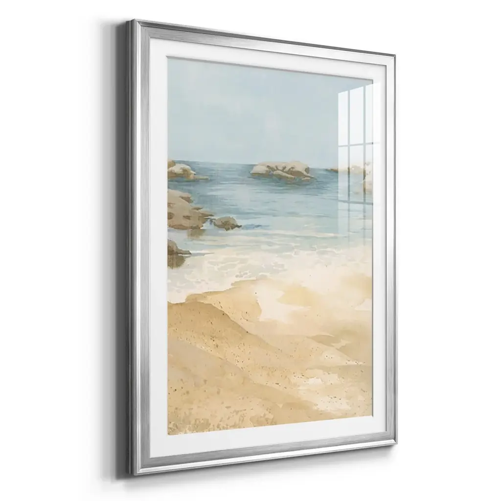Tranquil Beach I Premium Framed Print - Ready to Hang A Premium Framed Print created to last. Framed in distressed wood and available in an array of sizes and colors Featuring a beveled a solid wood stretcher bar, each piece comes ready to hand 4 SIZES AVAILABLE 30.5''X42.5'' - Overall Size 26.5'X36.5'' - Overall Size 22.5''x30.5'' - Overall Size 18.5''x24.5'' - Overall Size Each piece is made to order. Each piece comes with hanging hardware. Made in the USA Ready to Hang Giclee Paper Print Acrylic Glass Beveled Matt Board