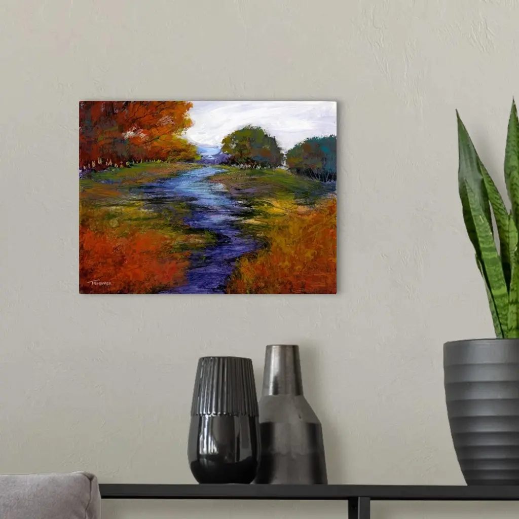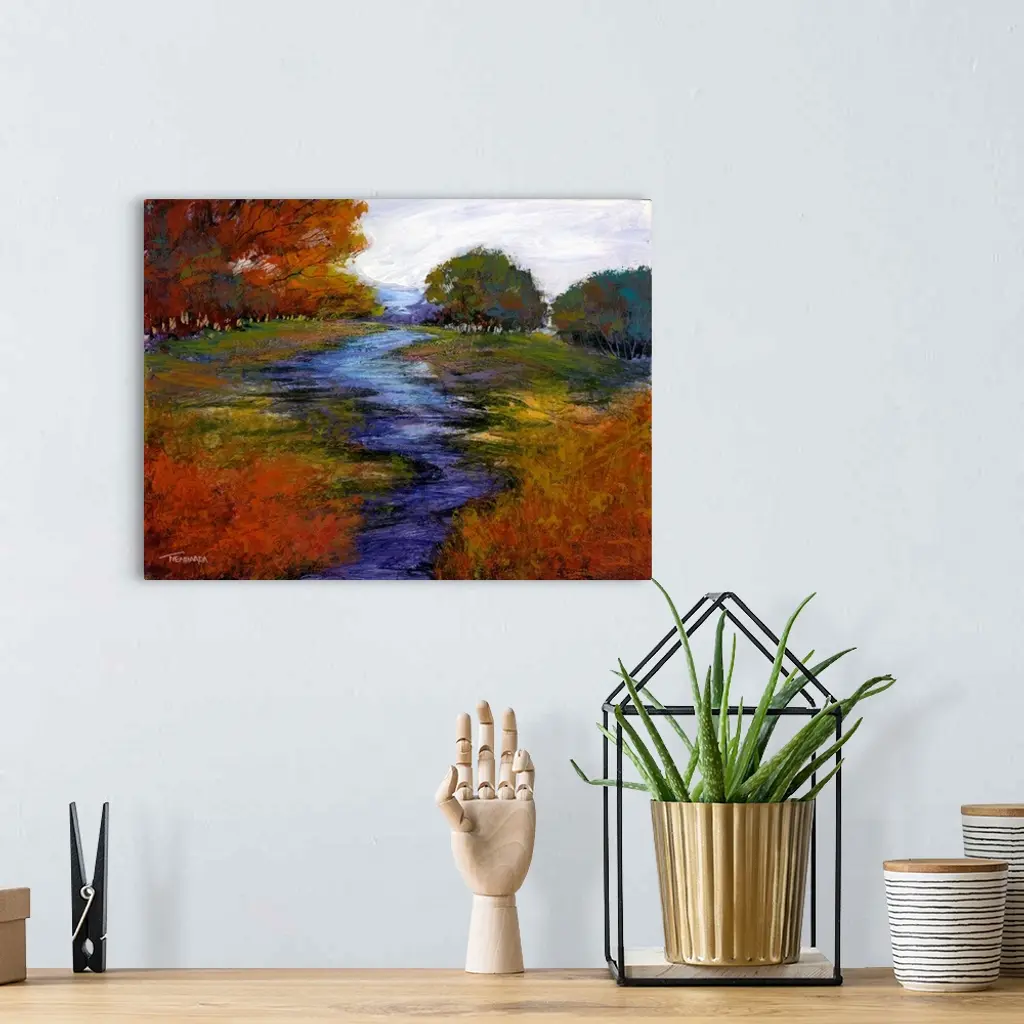 Contemporary painting of a landscape with Autumn trees and a blue and purple tinted creek flowing through the middle.