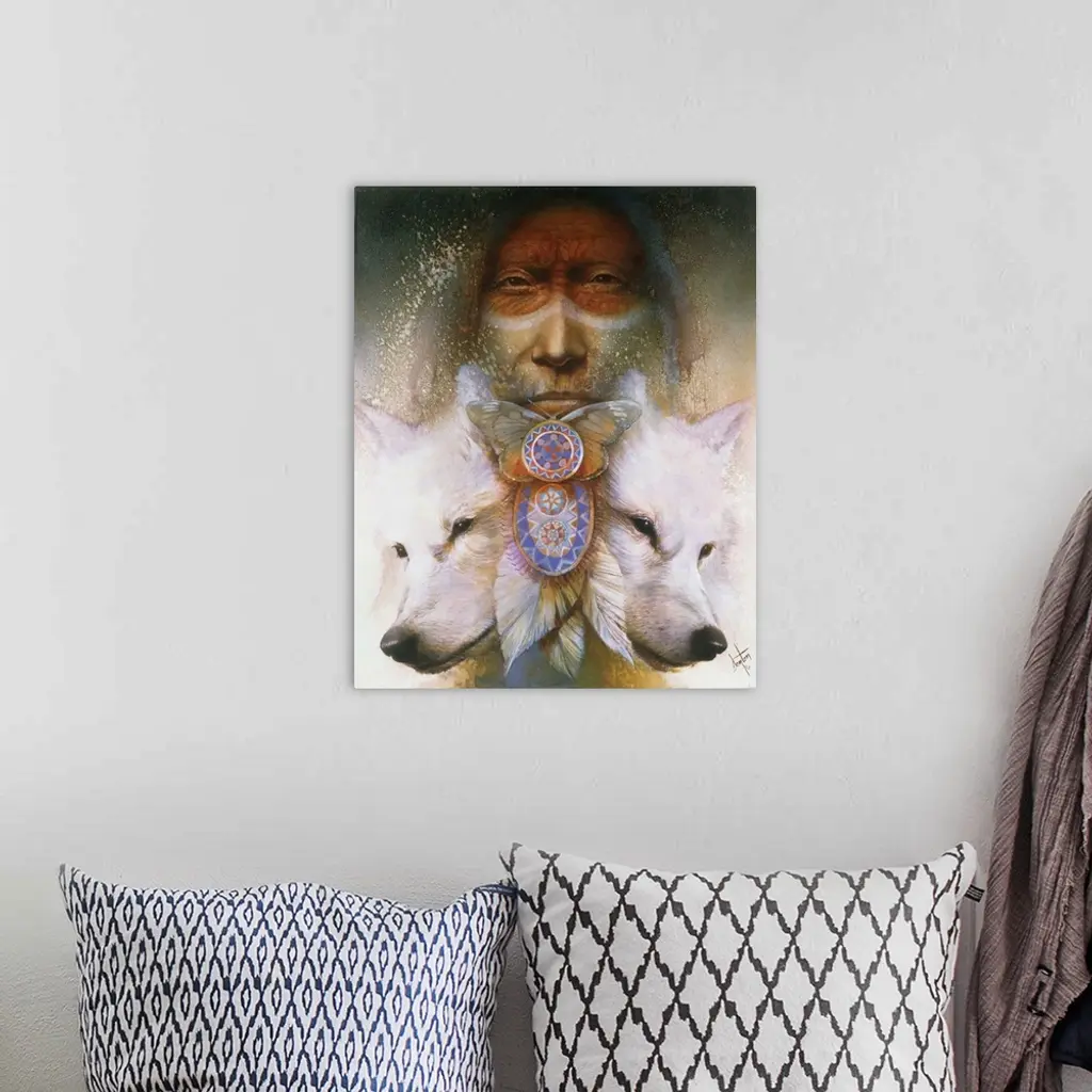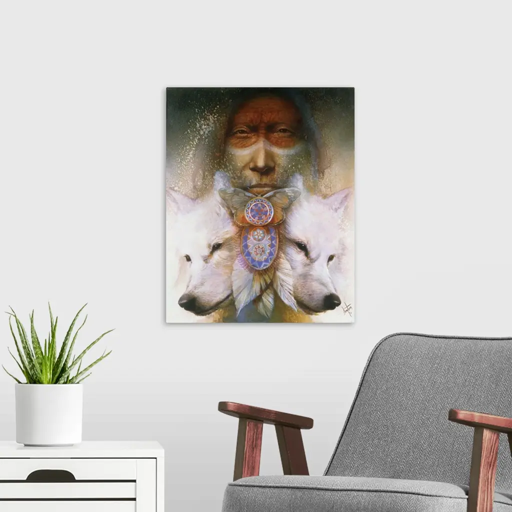 A contemporary painting of a Native American man staring straight on with two white wolf heads at the bottom of the image.
