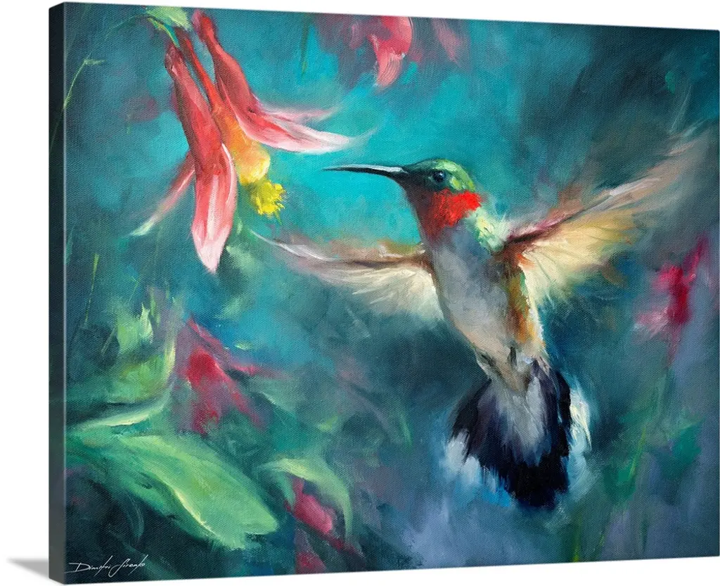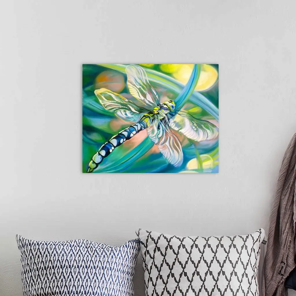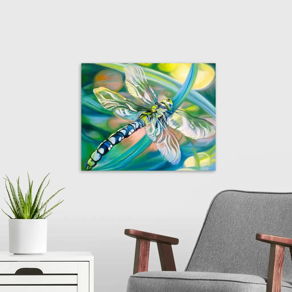 Transformation is a big green dragonfly painting on a blue turquoise and green background.