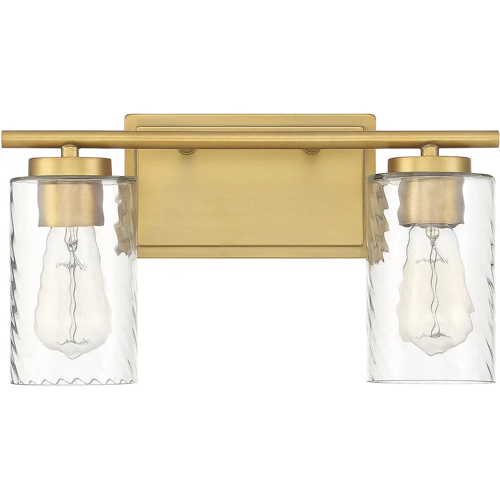 Make a big impact when you change out your old bathroom lights for this 2-light bath vanity light. It has a sleek look with intriguing shades of clear swirl glass and a natural brass finish. Can be mounted with the shades facing up or down. 8.63" in height and 15" in width. It extends 5.5" from the wall. Uses 2 standard size bulbs of up to 60 watts per bulb, is LED compatible, is dimmable and is damp area rated.