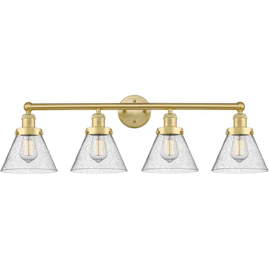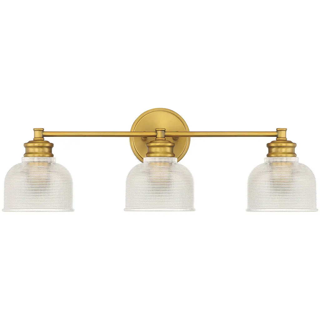 Vintage style inspiration is beautifully modernized in this 3-light bathroom vanity light. It features a streamlined style with shades of textured clear halophane glass, a circular backplate and a natural brass finish. Can be mounted with the shades facing up or down. 9.25" in height and 24.25" in width. Extends 6.5" from the wall. Uses 3 standard size bulbs of up to 60 watts per bulb, is LED compatible and is dimmable.