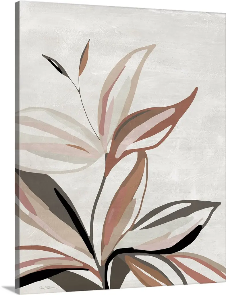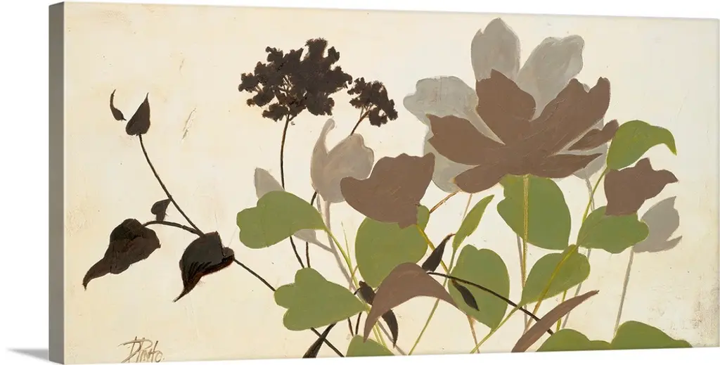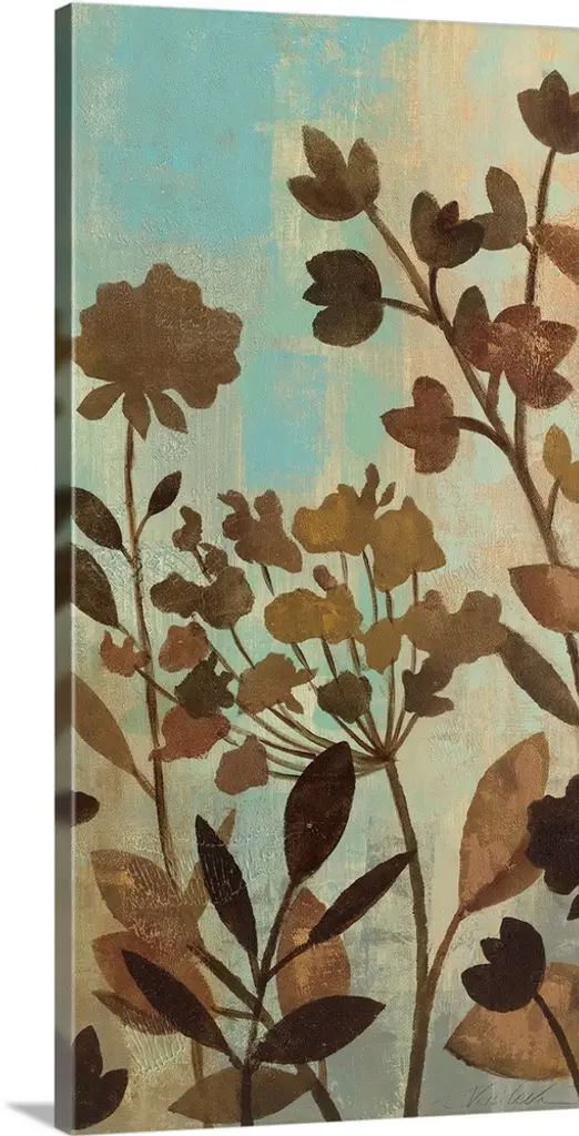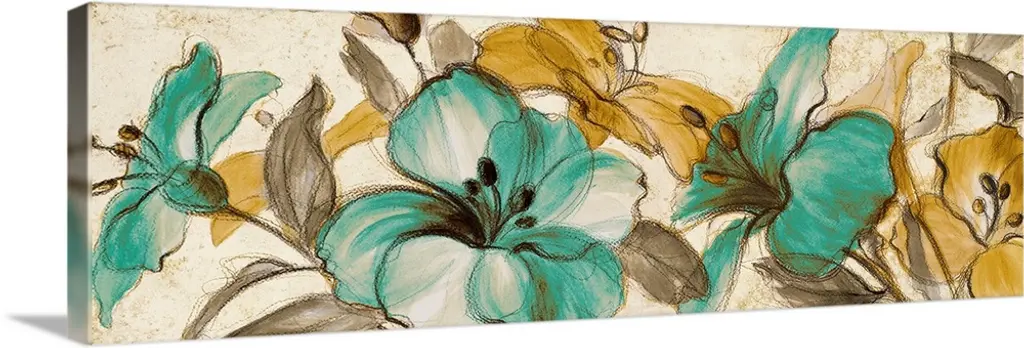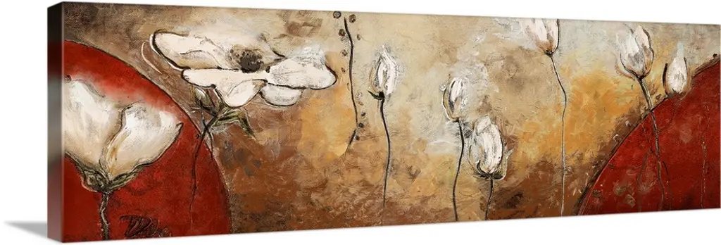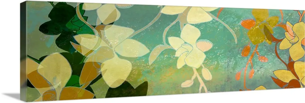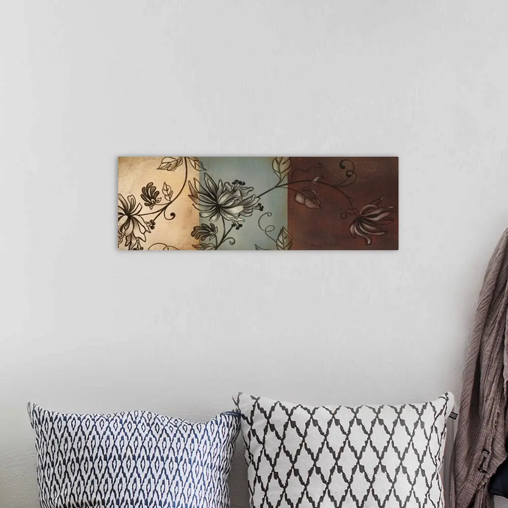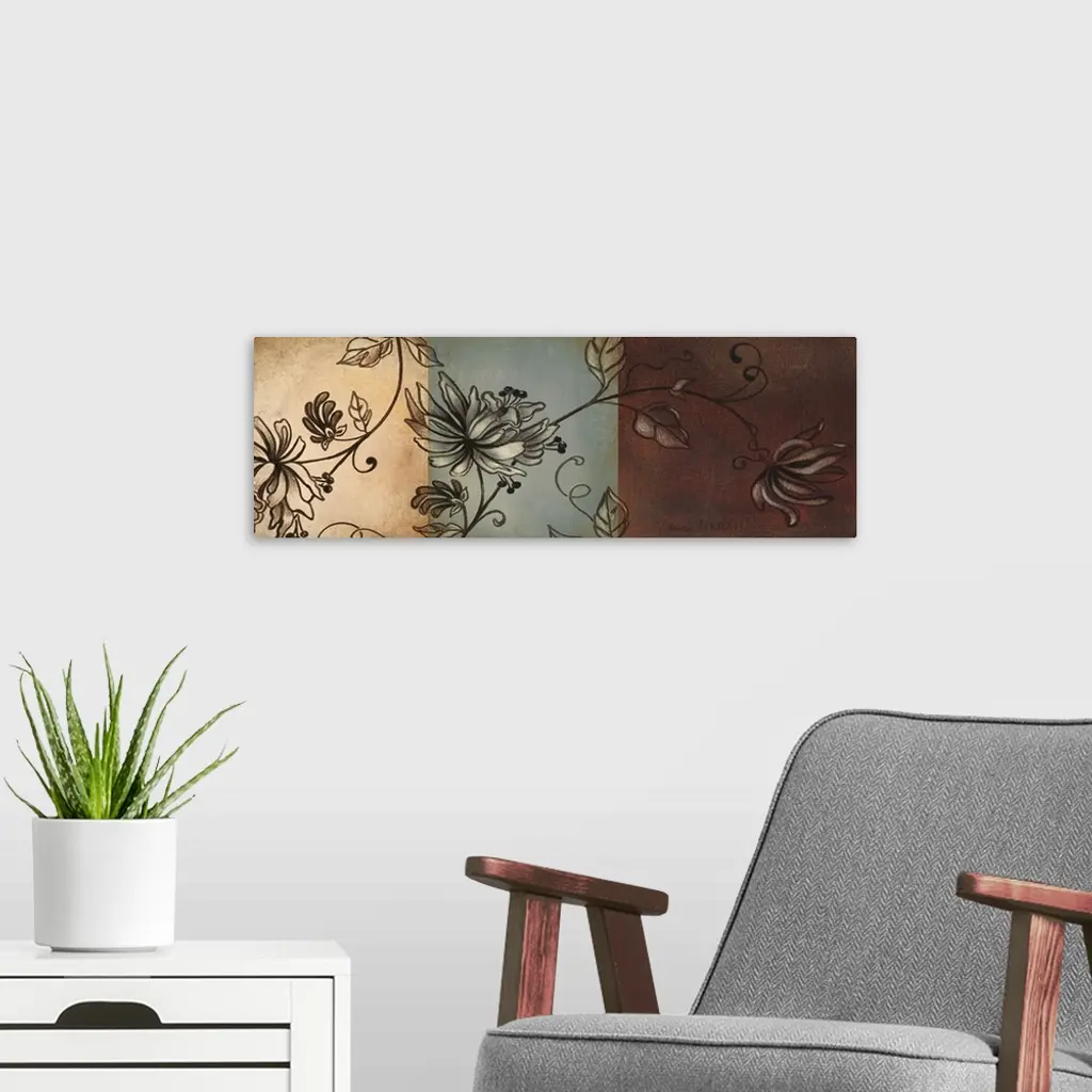 Panoramic contemporary painting of branches of flowers on a 3 panel color display.