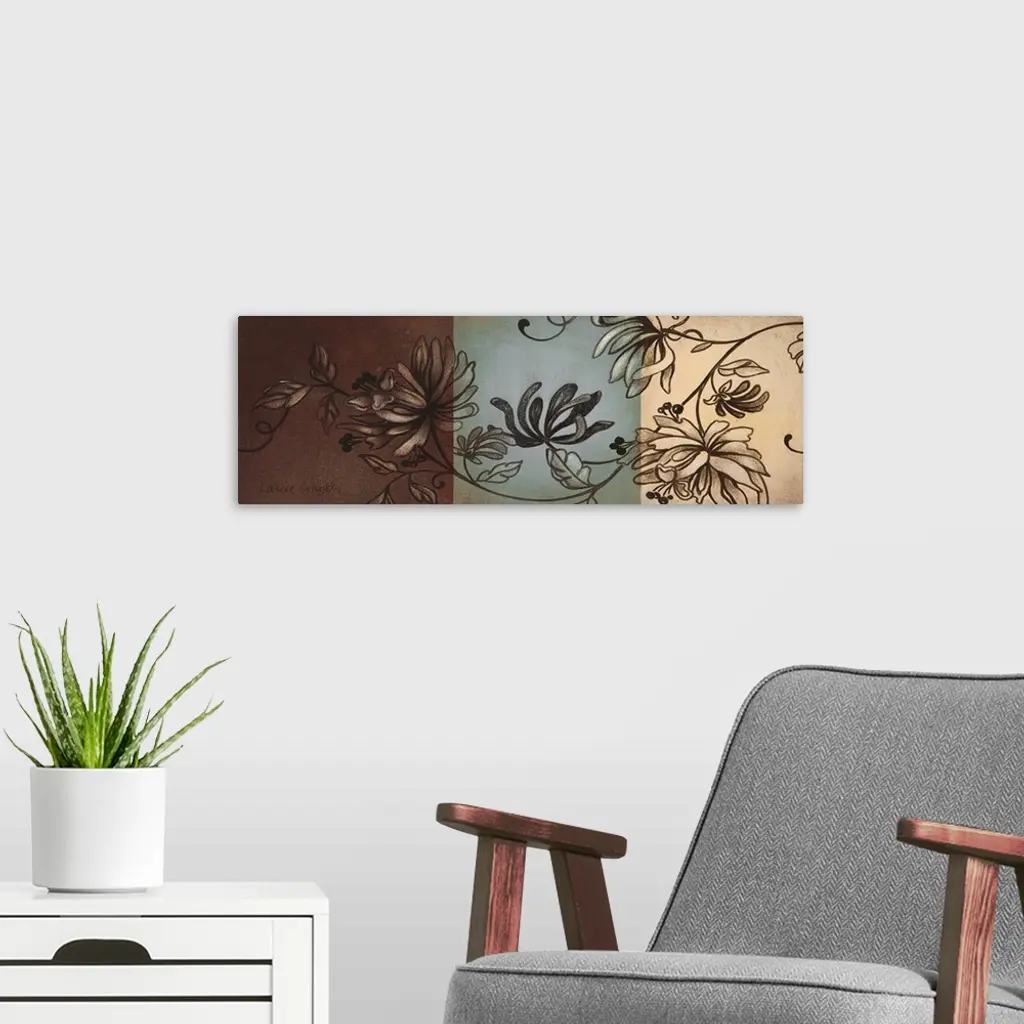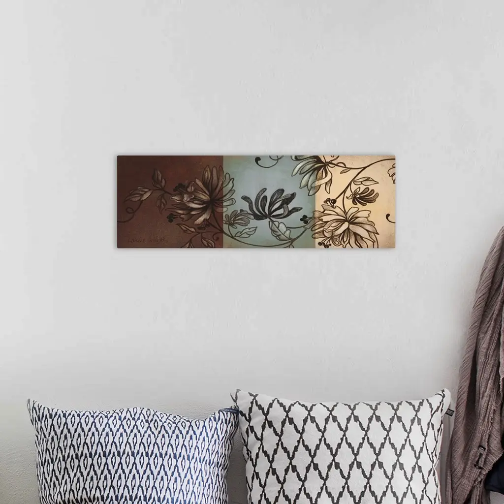 Panoramic painting of decorative floral design with geometric background made of squares.