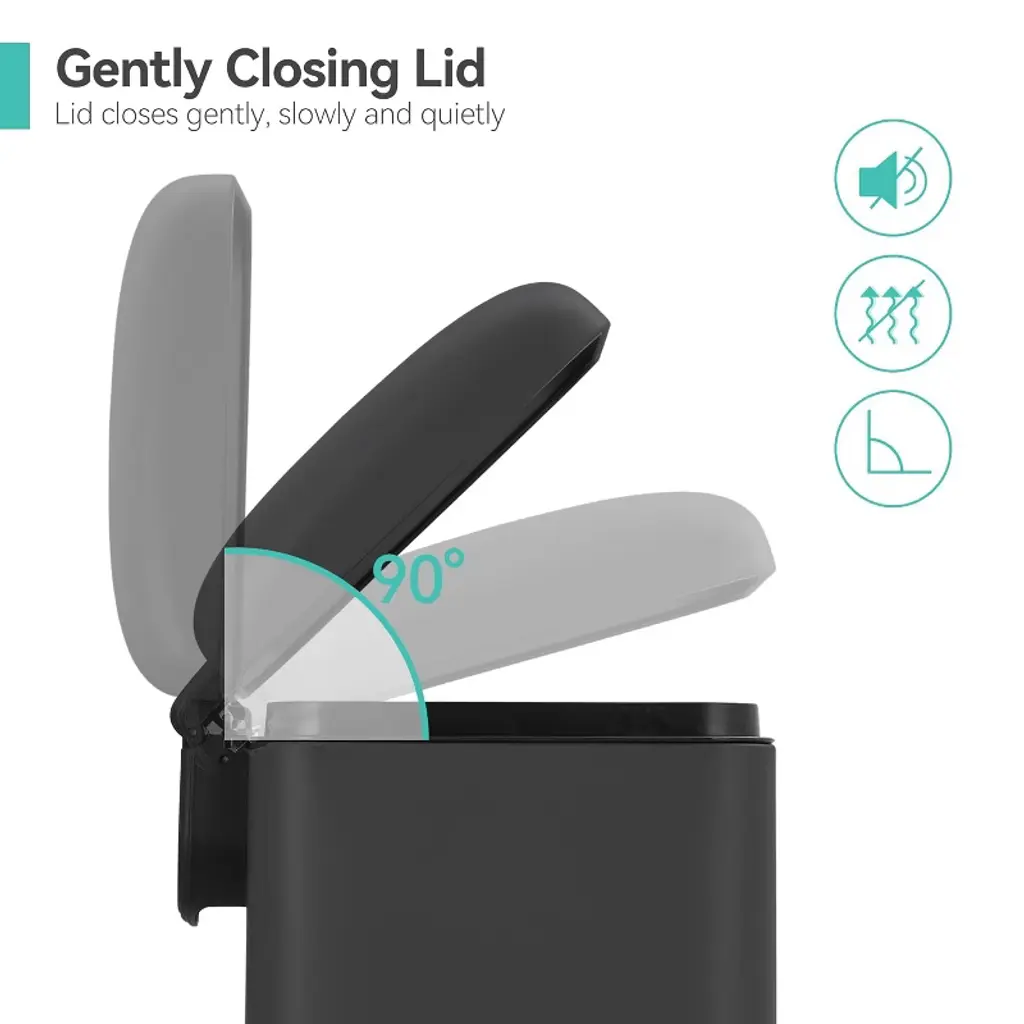 This 12-liter / 3.2-gallon trash can is designed to fit effortlessly into small kitchens and bathrooms, making it ideal for those tight corners. Its compact size ensures you have a reliable waste solution without sacrificing precious floor space.Made from premium stainless steel, this kitchen trash can features a smudge-resistant coating that keeps it looking pristine. This elegant finish not only enhances the look of your kitchen but also minimizes cleaning time, making maintenance a breeze.Enjoy a quiet experience with the soft-close lid that gently shuts without slamming. The handy step-on pedal allows for hands-free use, making it the perfect solution for busy households or when your hands are full.