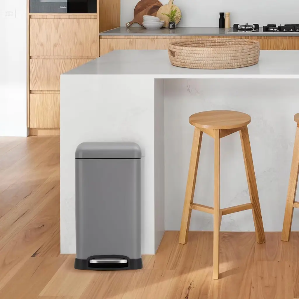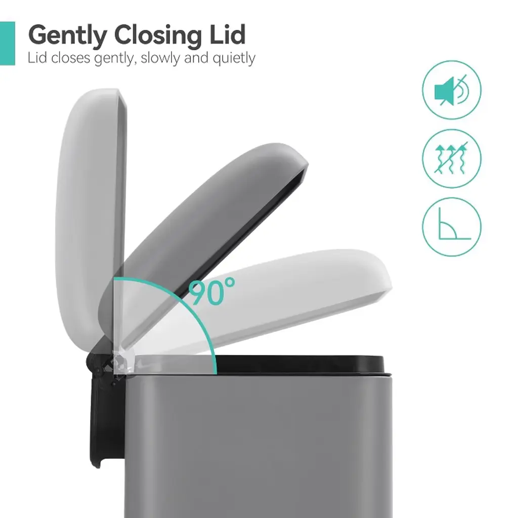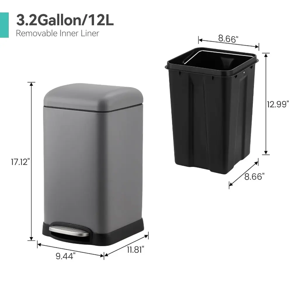 This 12-liter / 3.2-gallon trash can is designed to fit effortlessly into small kitchens and bathrooms, making it ideal for those tight corners. Its compact size ensures you have a reliable waste solution without sacrificing precious floor space.Made from premium stainless steel, this kitchen trash can features a smudge-resistant coating that keeps it looking pristine. This elegant finish not only enhances the look of your kitchen but also minimizes cleaning time, making maintenance a breeze.Enjoy a quiet experience with the soft-close lid that gently shuts without slamming. The handy step-on pedal allows for hands-free use, making it the perfect solution for busy households or when your hands are full.