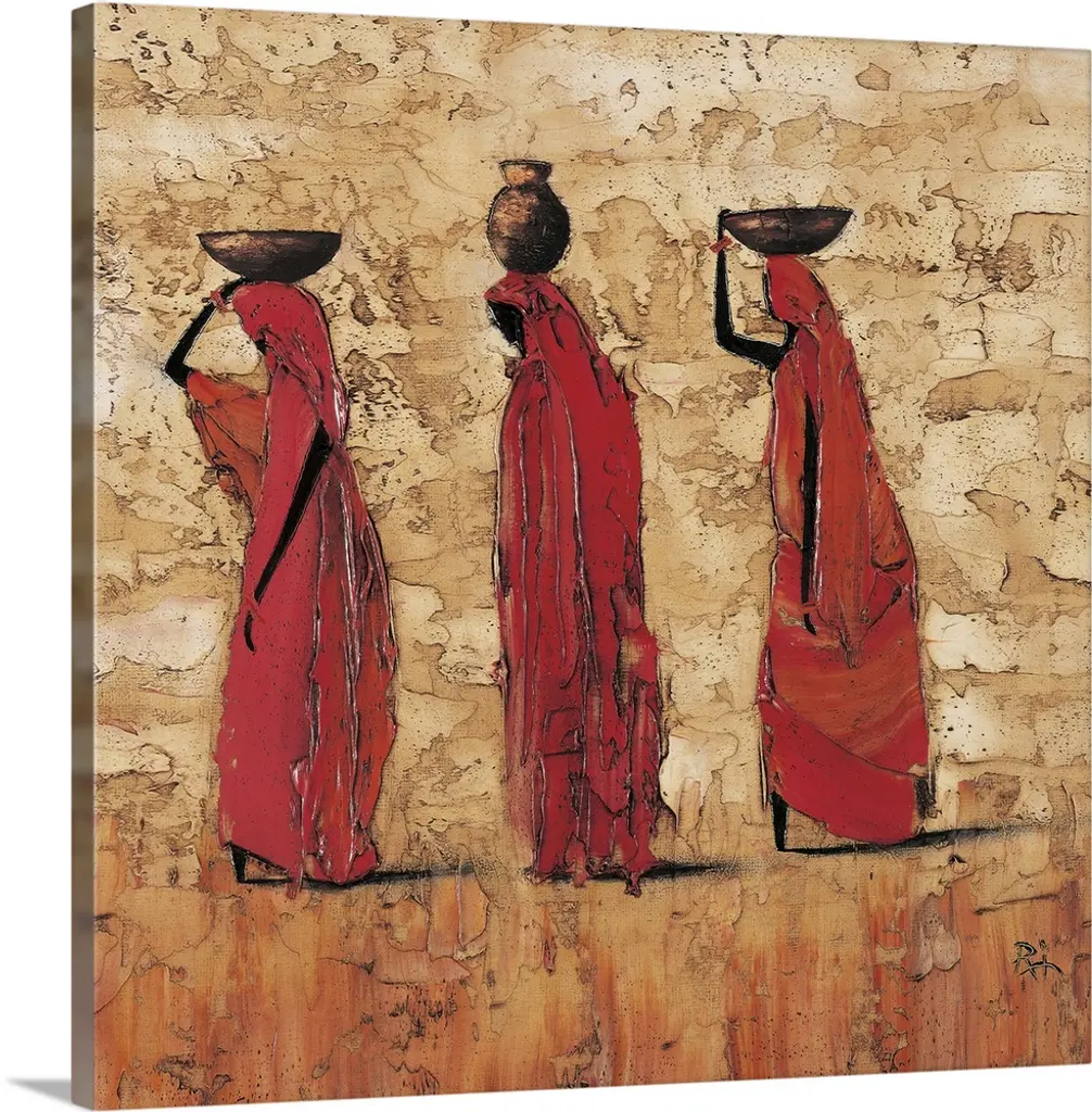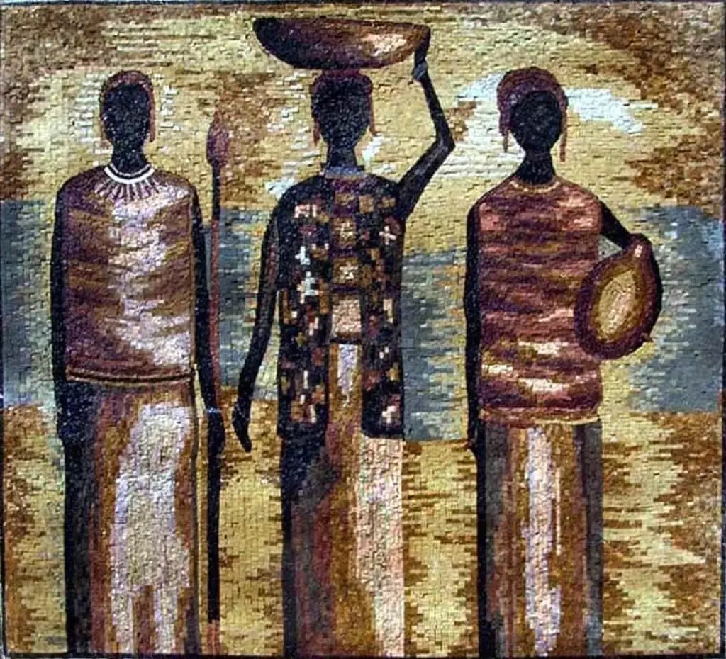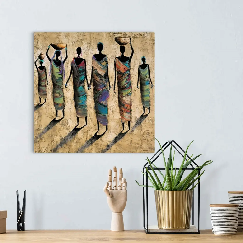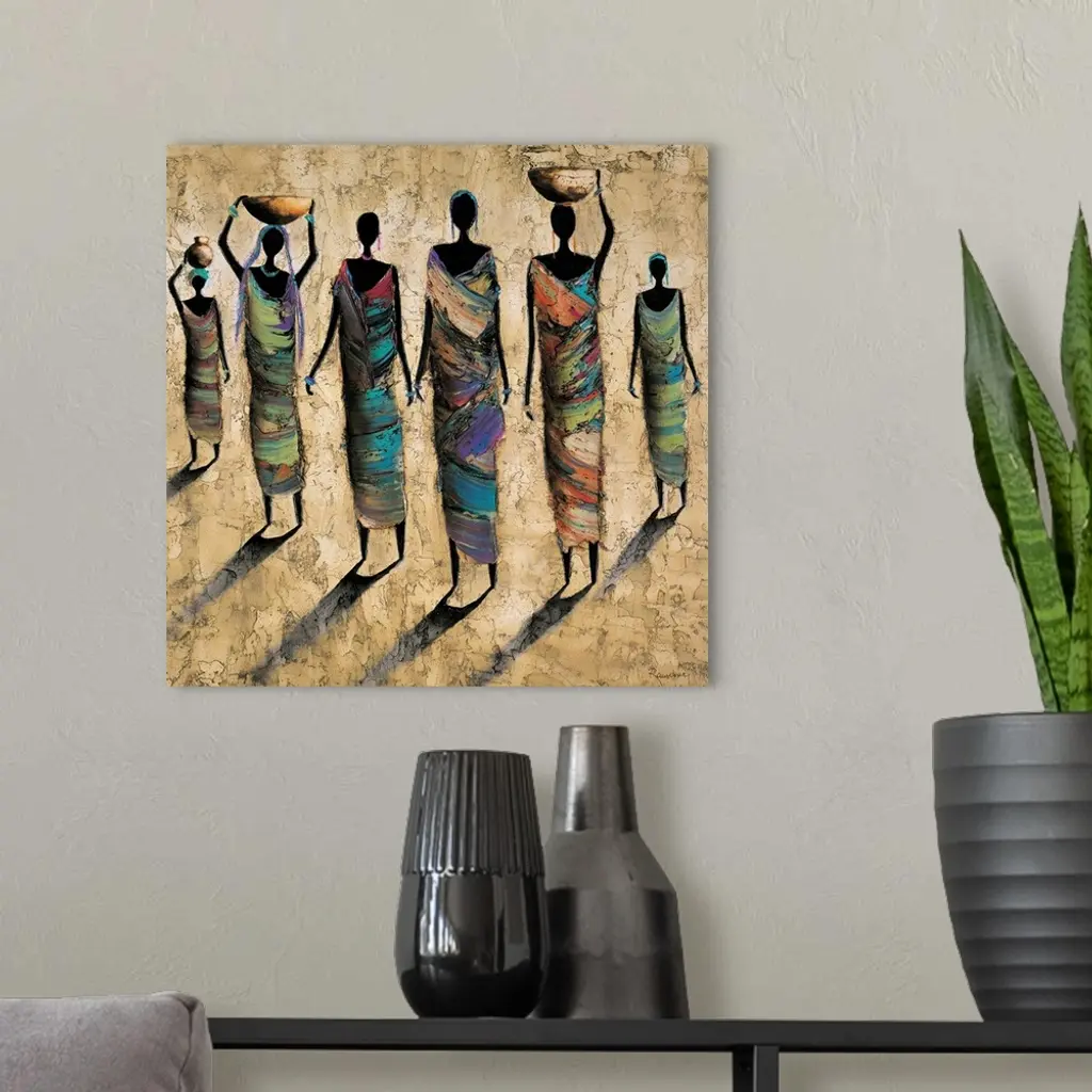 Contemporary painting of female tribal figures in colorful clothing casting shadows on the ground.
