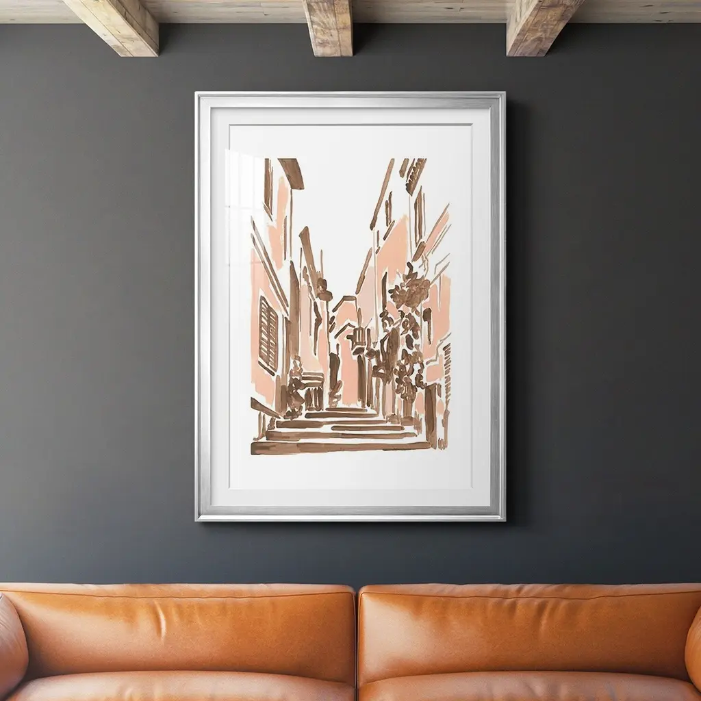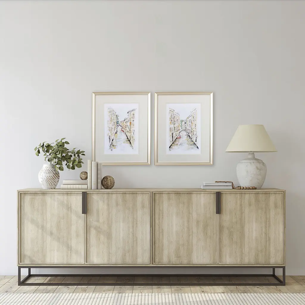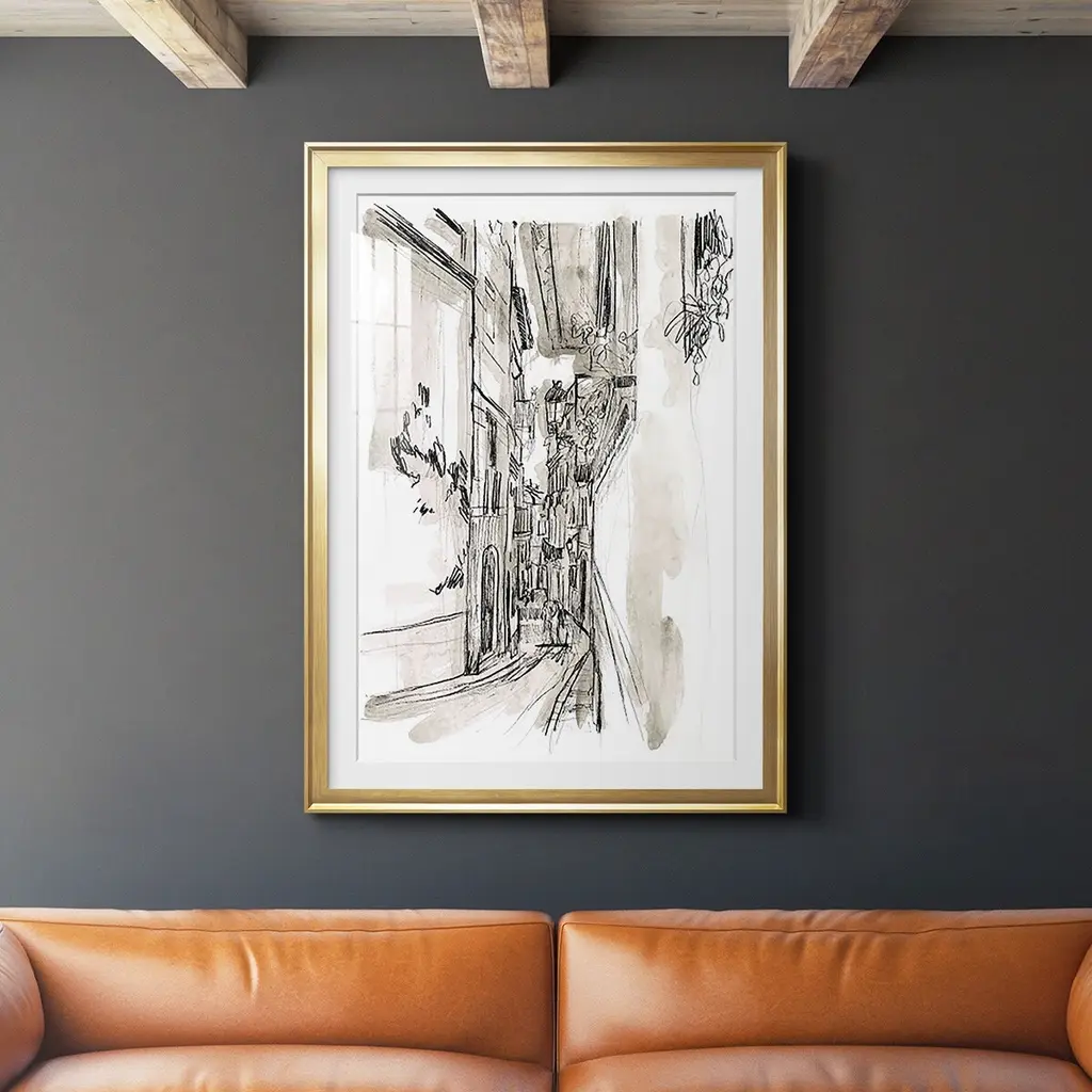 A set of two European scene sketch prints that are double matted, framed under glass and paired with a champagne frame.