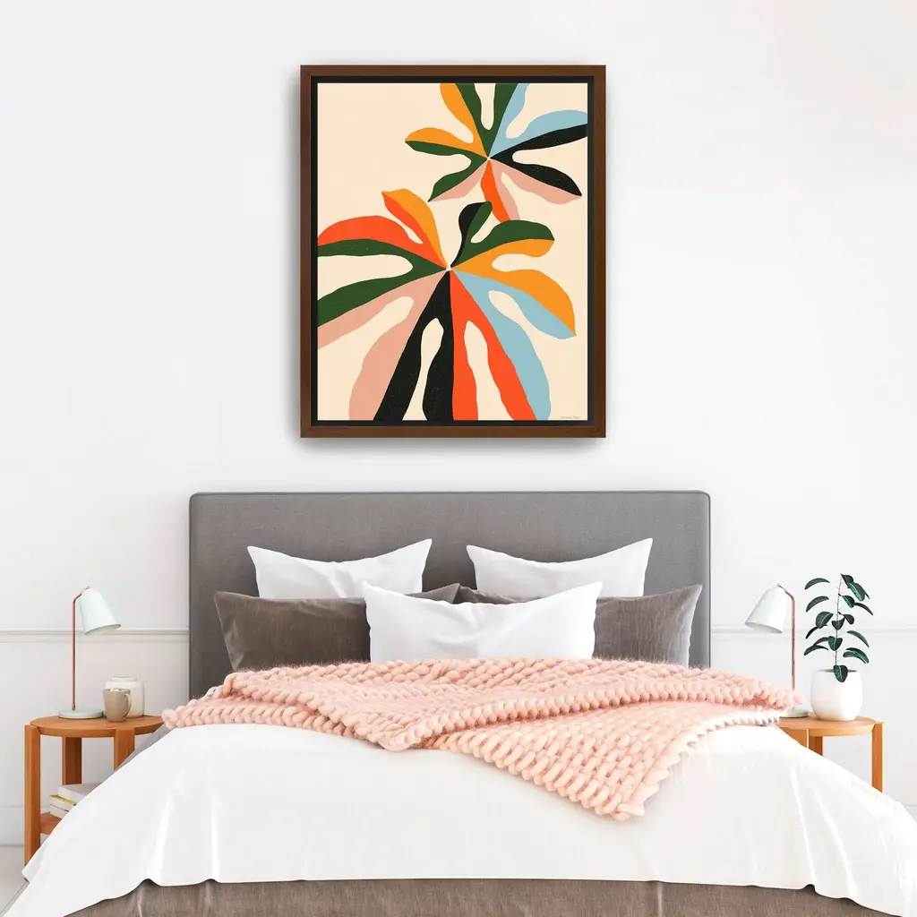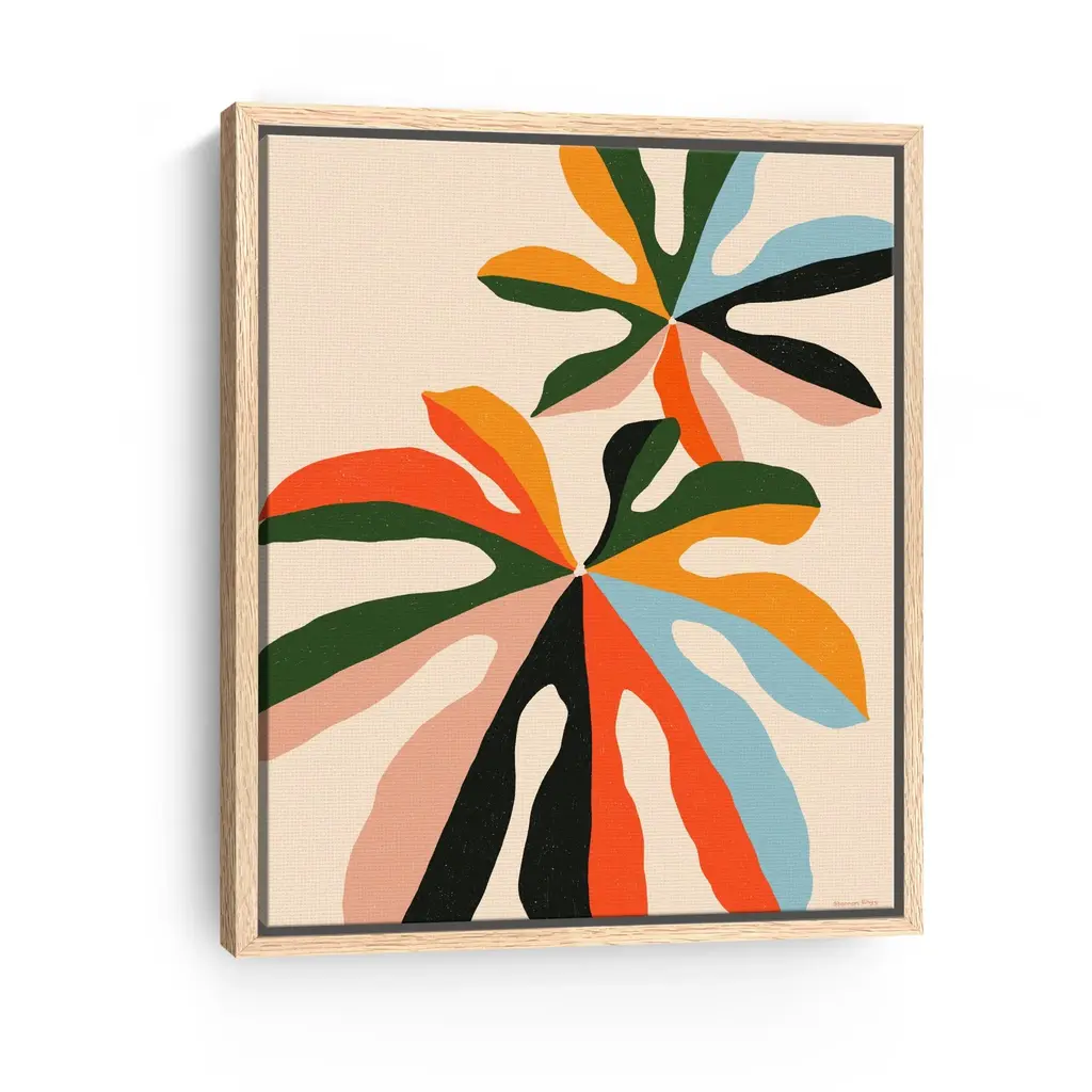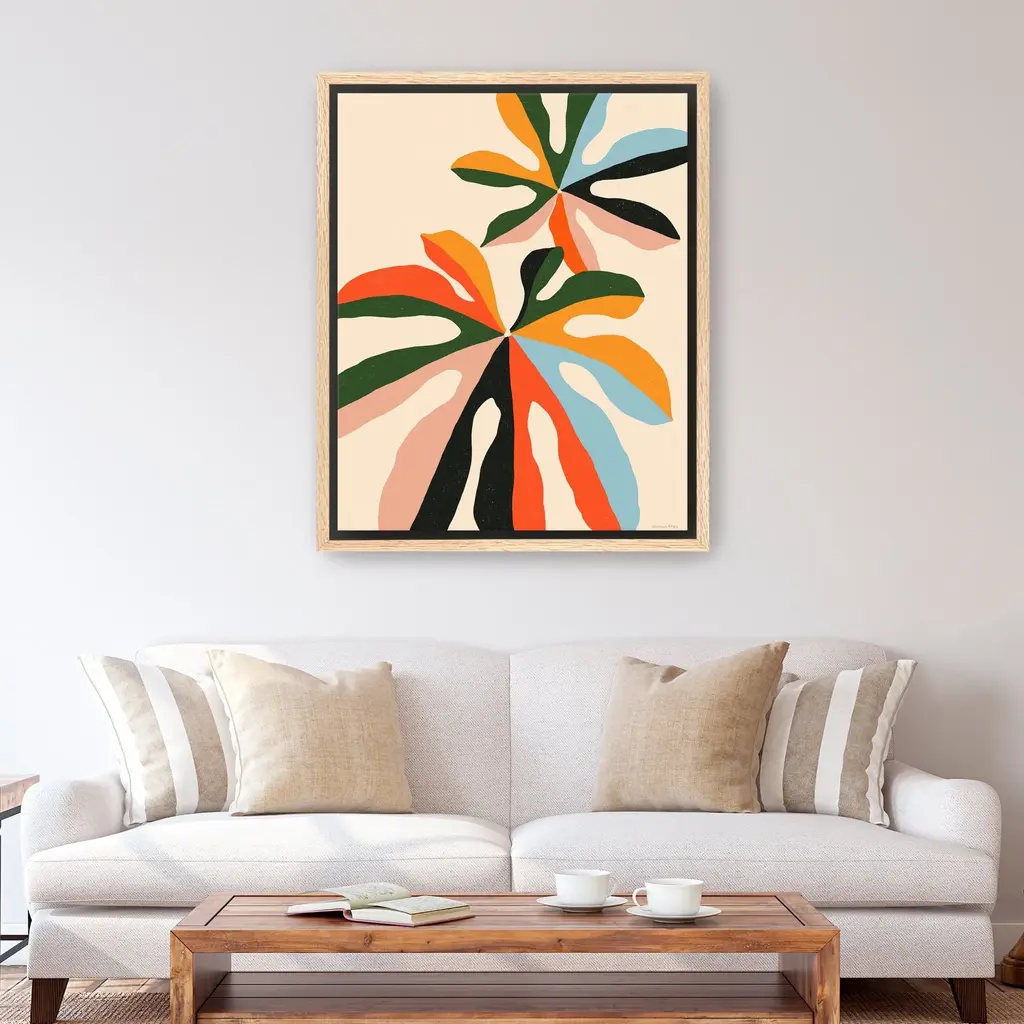 Introduce a breath of fresh air to your decor with this stunning abstract botanical canvas art print. Featuring an imaginative representation of botanical elements, this artwork harmoniously blends colors and shapes to create a captivating focal point.Available in black frame, dark walnut frame and oak frames, or as a frameless canvas. Our Gallery Wrap Canvas Prints are proudly assembled with high quality materials in California, USA. Each piece is printed on a thick, archival grade canvas using Giclee technology. It is then hand-stretched by our experienced artisans over solid pine bars, which will not warp over time. The final product is a piece personally crafted for you to confidently display on your wall. Care and Assembly: Ensure that the location of your piece has little to no exposure to heat, sunlight, and moisture. Wipe clean, only if needed. Each piece includes a sawtooth hanger to hang on your wall vertically.