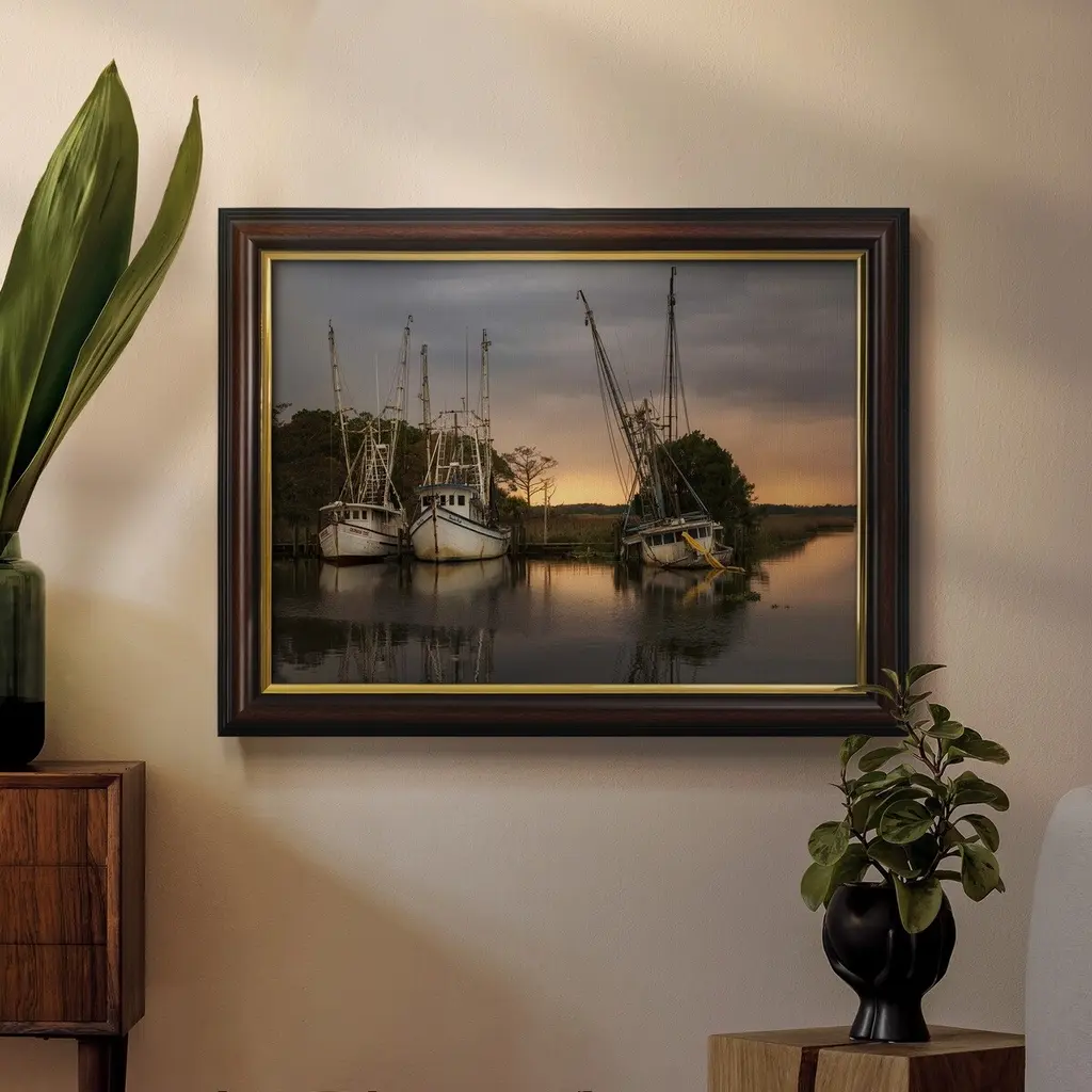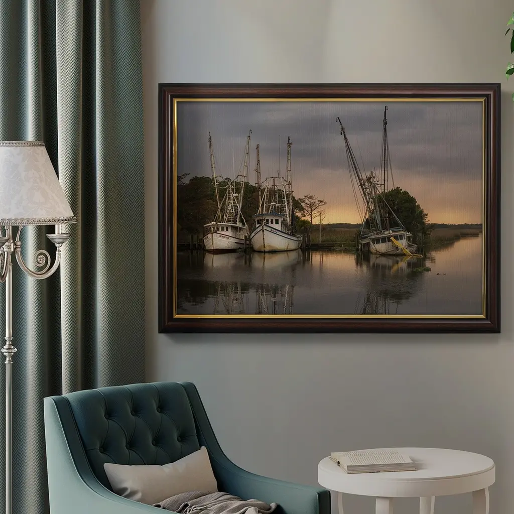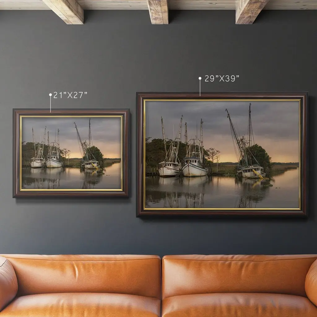 Trawlers Premium Framed Canvas- Ready to Hang A Premium Framed Canvas created to last. Framed in distressed wood and available in an array of sizes and colors Featuring a beveled a solid wood stretcher bar, each piece comes ready to hand 3 SIZES AVAILABLE 16''X20'' - Overall Size 18'X27'' - Overall Size 24''x36'' - Overall Size Each piece is made to order. Each piece comes with hanging hardware. Made in the USA Ready to Hang Giclee Paper Print Acrylic Glass Beveled Matt Board