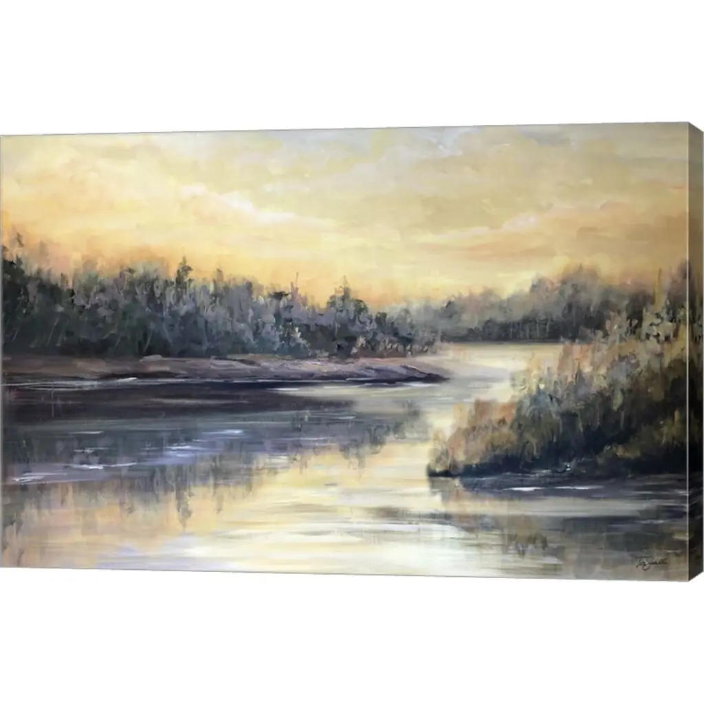 Golden Waters landscape by Tre Sorelle Studios is a high quality piece of canvas artwork. The finished size of this piece is 24" X 16", and it has a depth 1.5". There is a UV protective coating over the entire image, and it is ready to hang on your wall with no hardware required. 100% Satisfaction Guaranteed.