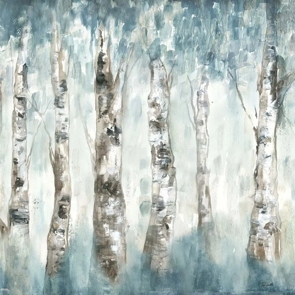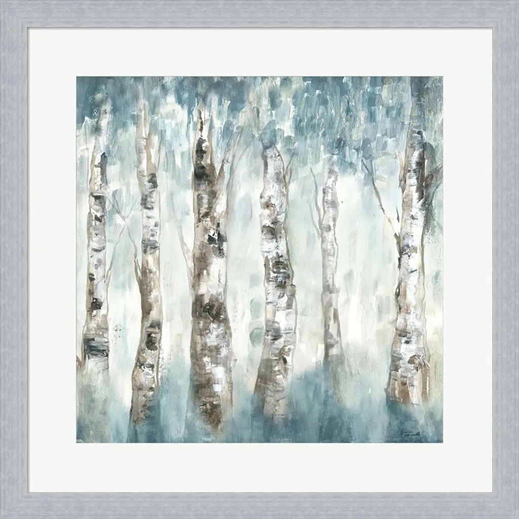 Winter Aspen Fog by Tre Sorelle Studios is a high quality piece of framed artwork. The finished size of this piece is 19.5" X 19.5". It has a Slim Platinum Silver frame, is single matted and finished with high quality Glass.