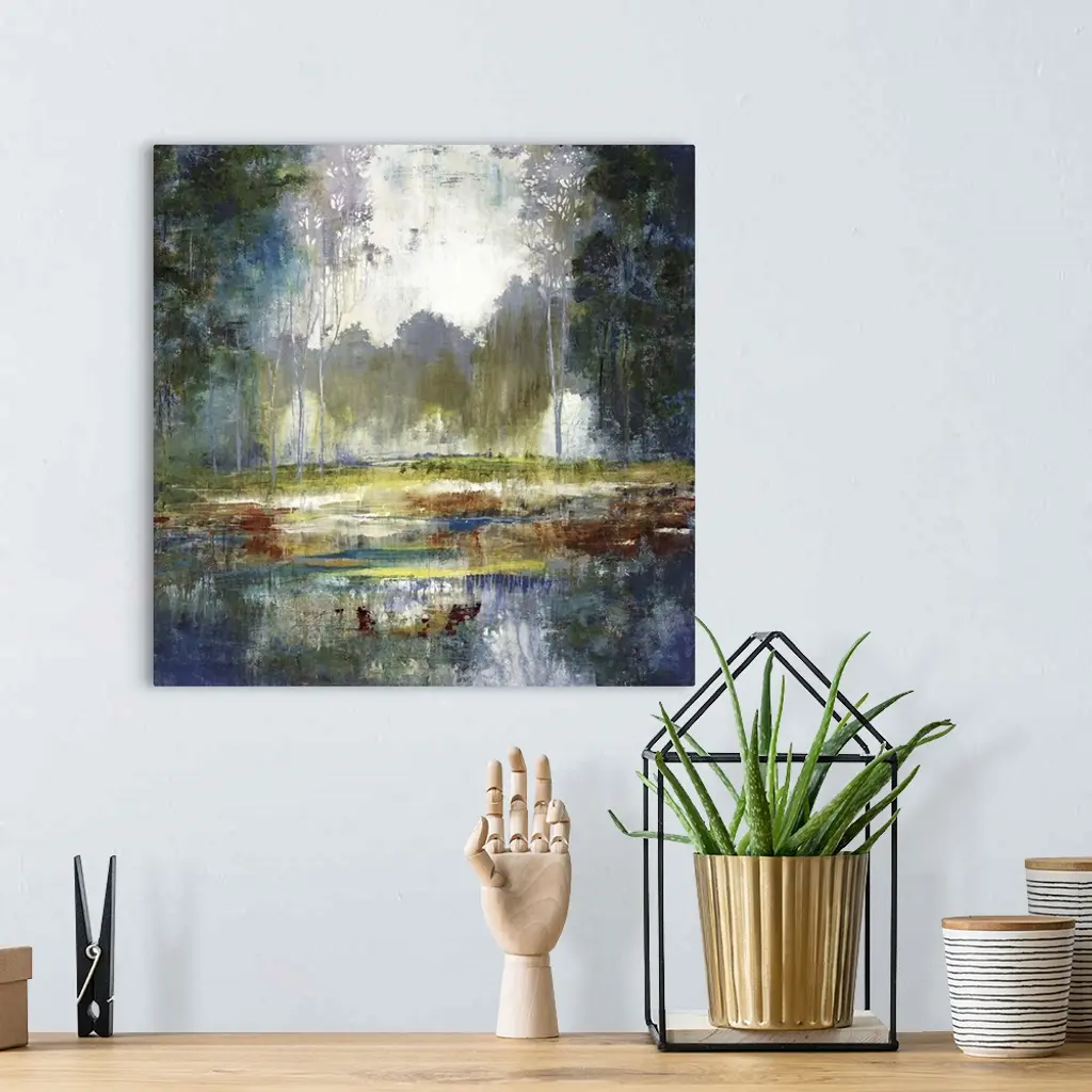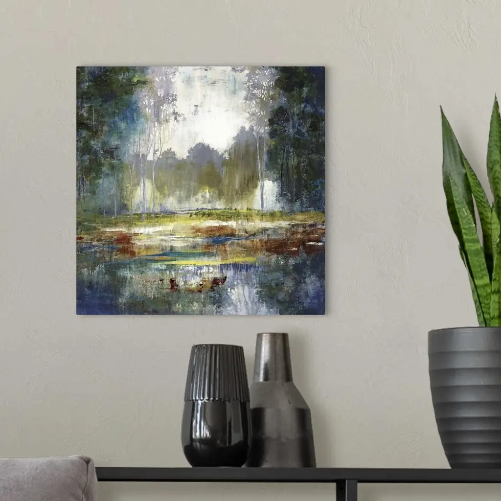 Square painting of an abstract landscape with earthy colors and a line of trees in the distance.