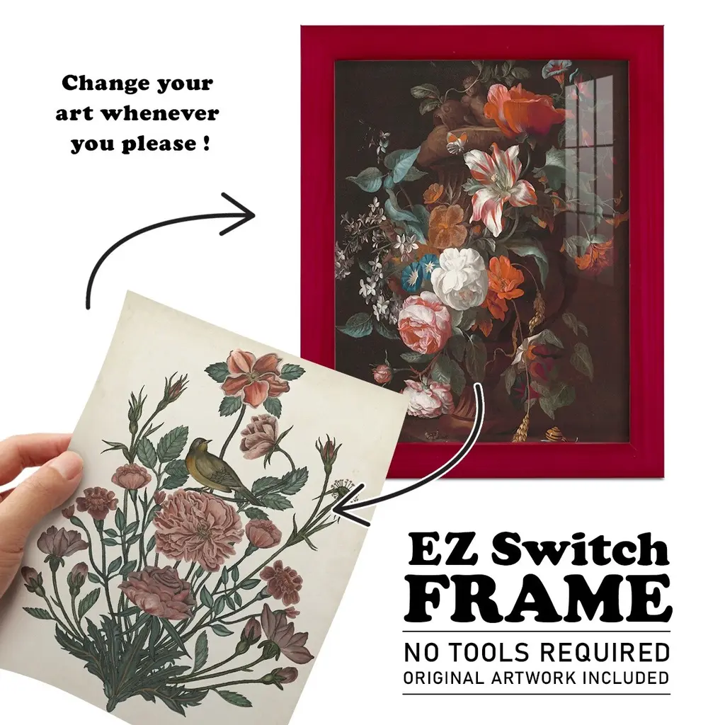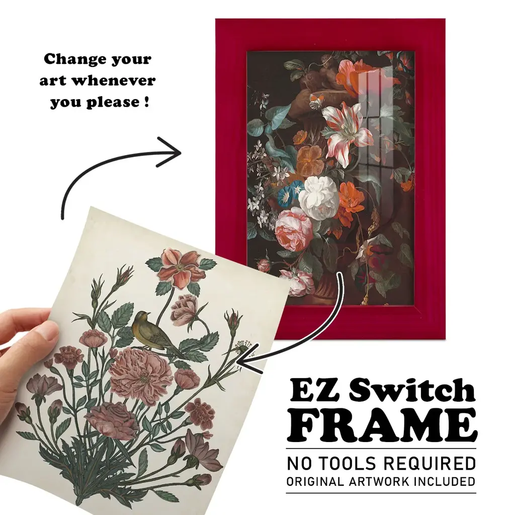 Treasures of the Earth II -EZ SWITCH Framed Print w/glass-Cherry Red A delightful, framed print. Featuring a solid wood frame with real wood glass. This premium print is giclee quality. In addition, every frame features a removable back and table top stand. This allows you to change your art in the future or to just stand the art on a table for a new look. We are sure you'll enjoy our new series of EZ SWITCH Framed Art. Solid Wood Frame Real Glass Removable / Replaceable Art Built in Tabletop Stand Sizes range from 4x6 up to 12x15 - buy just one or pair them up as sets as you see fit.