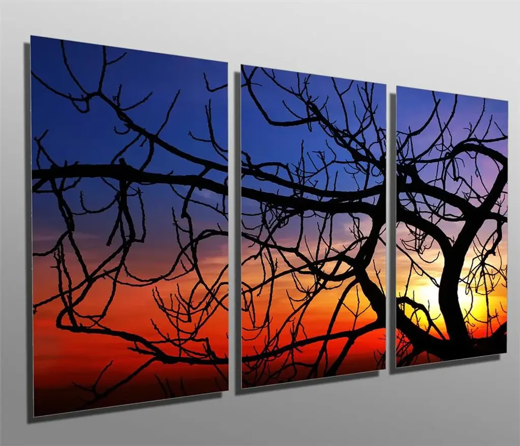 36"œ x 18"œ total size. Ready To Hang! (3 pieces - 12"œ x 18"œ each). 3 Panel Split (Triptych) Metal Print featuring Tree Fig at sunset. Modern metal wall art for home or office wall decor & interior design. Printed on Luxurious, HD aluminum glossy metal panels. Multi panel art.. HD aluminum panels. Metal print wall art. Includes Shadow Wall Mount on the back.• Aluminum Metal Wall Art• Made in USA• Ready to hang - No assembly required• Shadow mount hardware on the back• 0.045"œ thick HD Aluminum Panels• Scratch resistant, glossy finish• Superb color clarity, luxurious prints• Epson printing process• For indoor or moisture rich environment use• Easy to clean. Gently wipe with microfiber cloth.