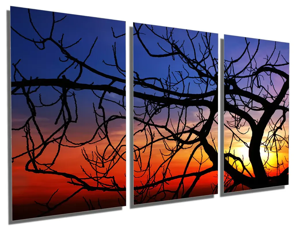 60"œ x 30"œ total size. Ready To Hang! (3 pieces - 20"œ x 30"œ each). 3 Panel Split (Triptych) Metal Print featuring Tree Fig at sunset. Modern metal wall art for home or office wall decor & interior design. Printed on Luxurious, HD aluminum glossy metal panels. Multi panel art.. HD aluminum panels. Metal print wall art. Includes Shadow Wall Mount on the back.• Aluminum Metal Wall Art• Made in USA• Ready to hang - No assembly required• Shadow mount hardware on the back• 0.045"œ thick HD Aluminum Panels• Scratch resistant, glossy finish• Superb color clarity, luxurious prints• Epson printing process• For indoor or moisture rich environment use• Easy to clean. Gently wipe with microfiber cloth.