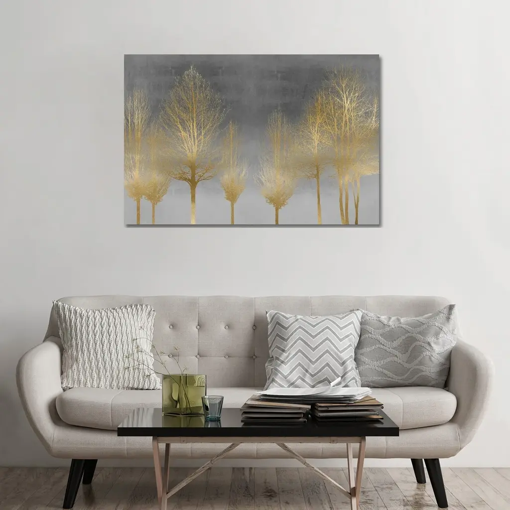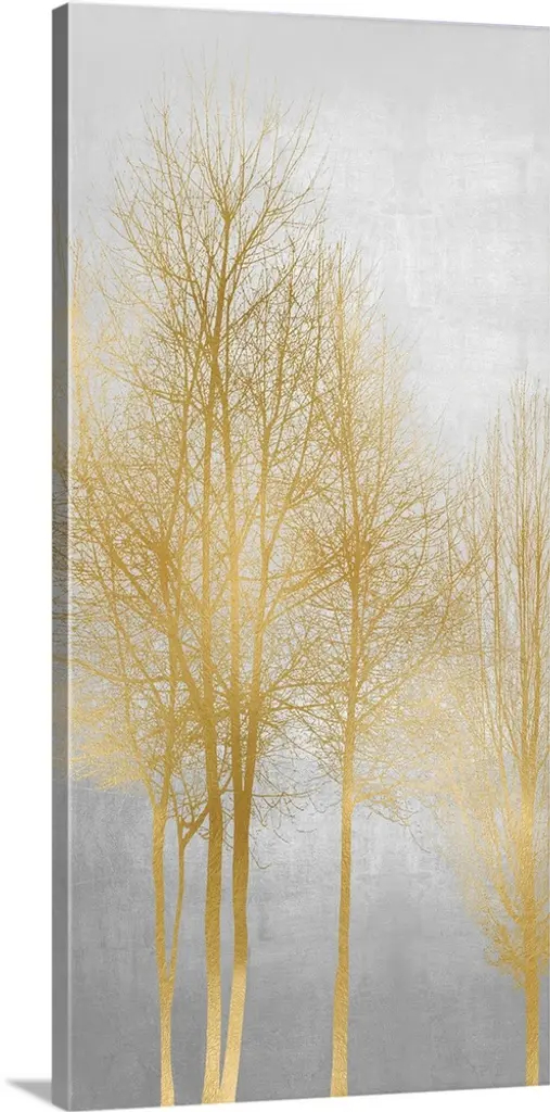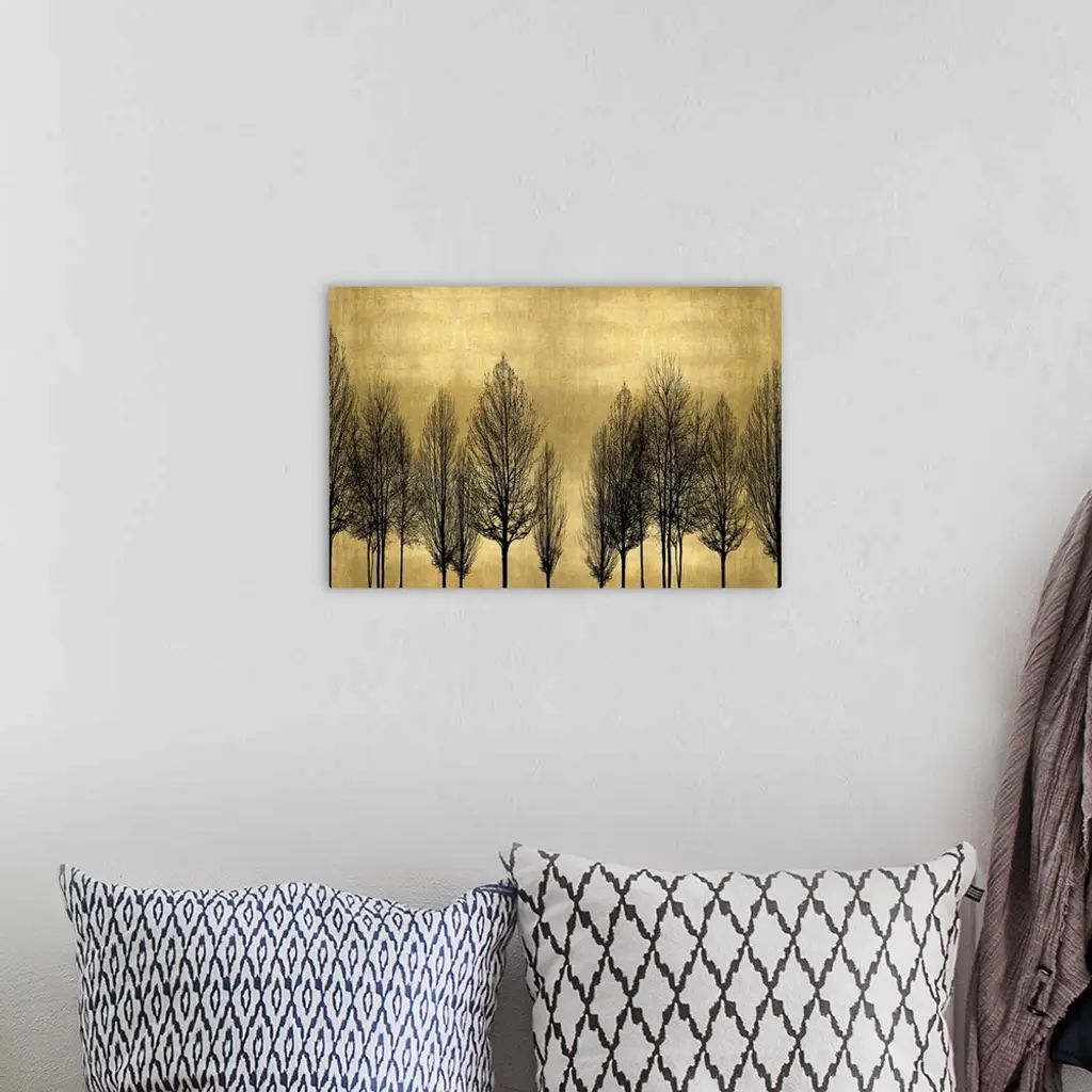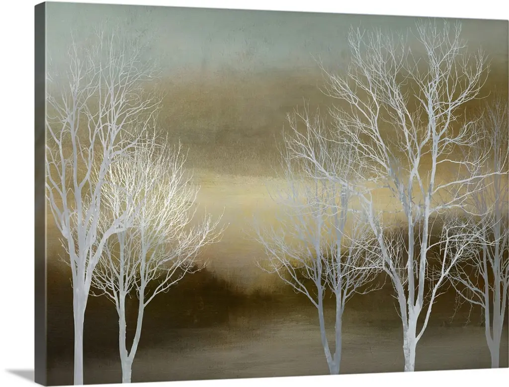 Decorative artwork featuring a black silhouette of leafless trees over a distressed background
