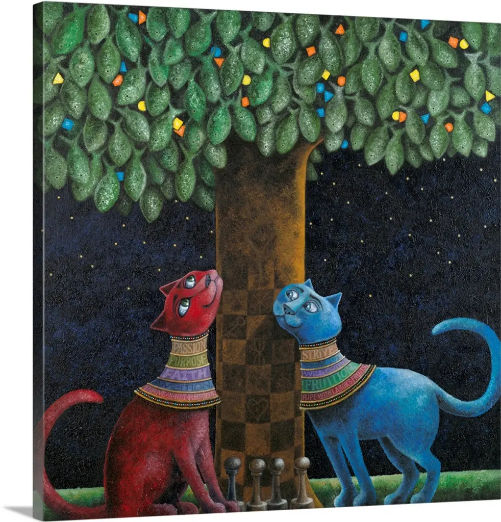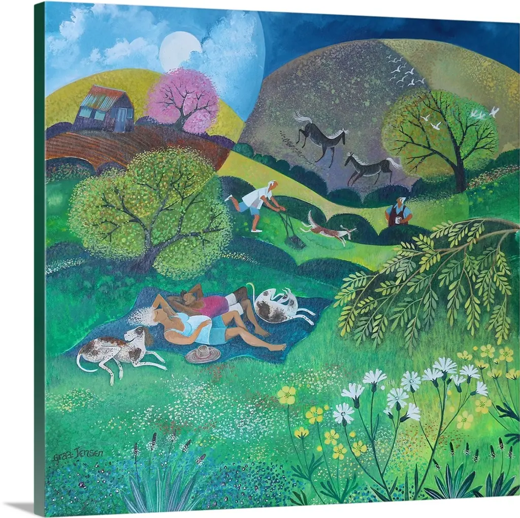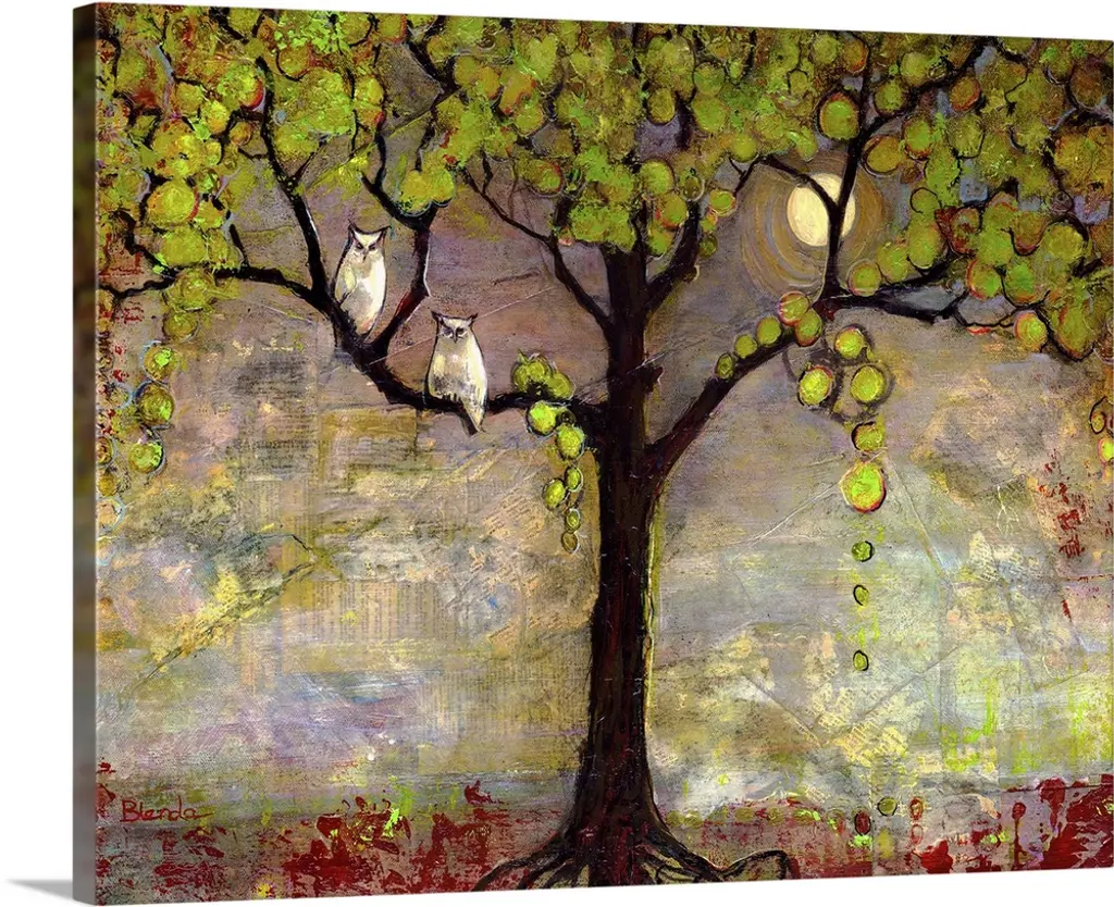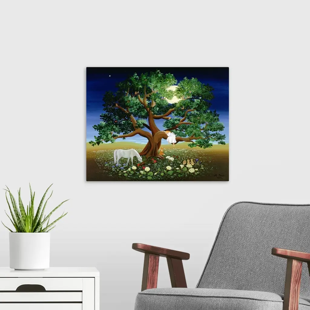 Fantasy painting of a girl sleeping on the branch of a large tree with many animals and plants below her during a full moon.