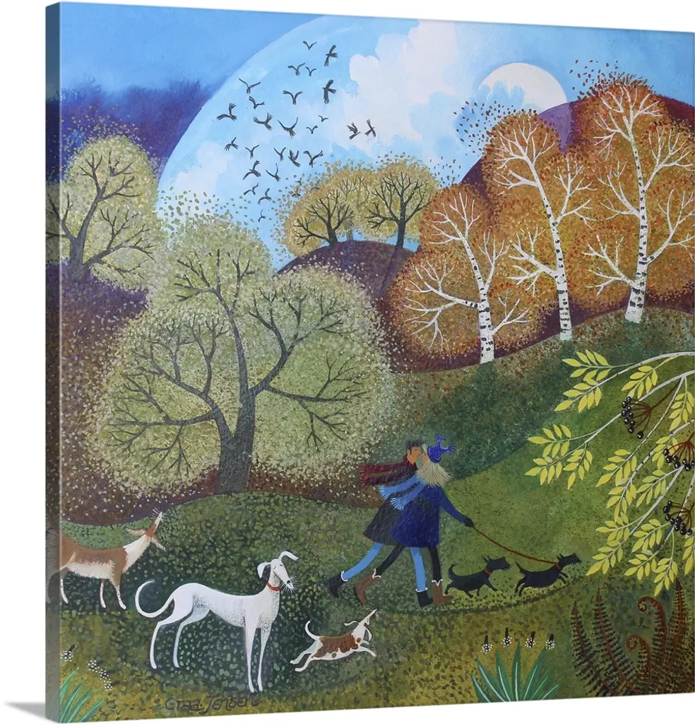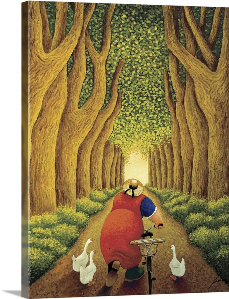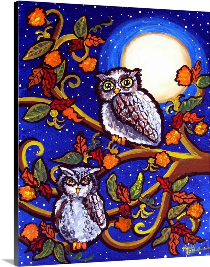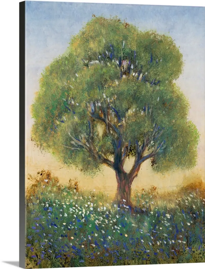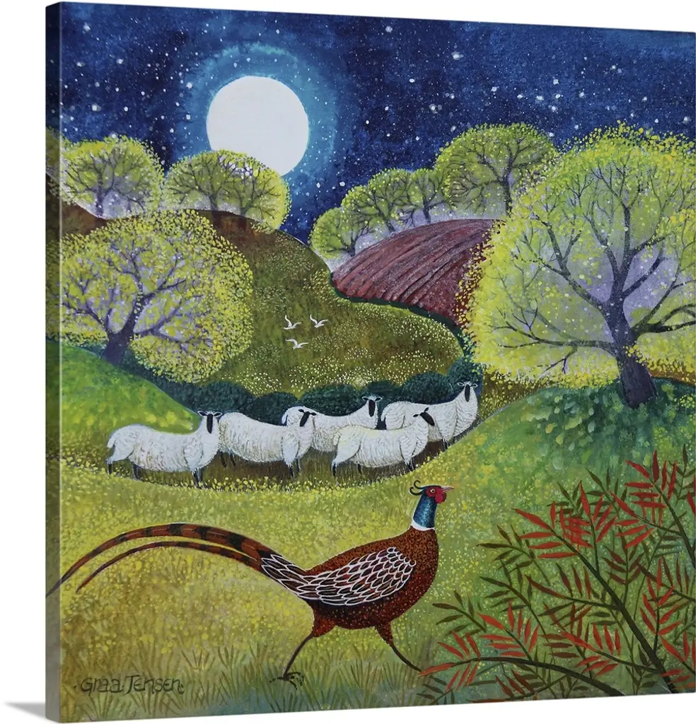 Fantasy painting of a girl sleeping on the branch of a large tree with many animals and plants below her during a full moon.