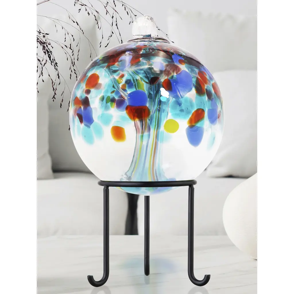 At Dale Tiffany, we strive to keep abreast of the latest home décor trends. As a result, we are pleased to present our Tree of Life Collection. The collection features an impressive array of Hand Blown Art Glass Ornaments in a variety of sizes and colors to suit every taste and décor. They are an effortless way to add a splash of color to any home, inside and out. Each Ornament is painstakingly hand blown using Favrile Art Glass. Each Ornament includes a clear glass loop at its top to facilitate hanging in any of the available stands, hangers, and garden stakes. Our hand blown process embeds color within the glass itself, which means that no 2 pieces are exactly alike and ensures yours are a dazzling one of a kind 3-dimensional art piece you will proudly display in your home or garden for many years to come. Due to the nature of handcrafted art glass, colors, sizes and patterns may vary slightly. (Stand or Metal Hanger Not Included) "Devotion": a bold celebration of blues, reds, yellows and ambers in an abstract tree pattern, against a clear glass background that will add a bright pop of color to any decor. Also available in 4“ and 8“ diameters.