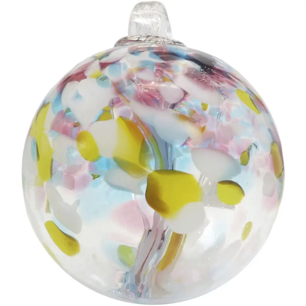 At Dale Tiffany, we strive to keep abreast of the latest home décor trends. As a result, we are pleased to present our Tree of Life Collection. The collection features an impressive array of Hand Blown Art Glass Ornaments in a variety of sizes and colors to suit every taste and décor. They are an effortless way to add a splash of color to any home, inside and out. Each Ornament is painstakingly hand blown using Favrile Art Glass. Each Ornament includes a clear glass loop at its top to facilitate hanging in any of the available stands, hangers, and garden stakes. Our hand blown process embeds color within the glass itself, which means that no 2 pieces are exactly alike and ensures yours are a dazzling one of a kind 3-dimensional art piece you will proudly display in your home or garden for many years to come. Due to the nature of handcrafted art glass, colors, sizes and patterns may vary slightly. (Stand or Metal Hanger Not Included) "Eden": a brightly created tree design crafted in bright red, yellow, amber, and white tones against a clear glass background. Also available in 3“ (2PK), 4“ and 10“diameters.