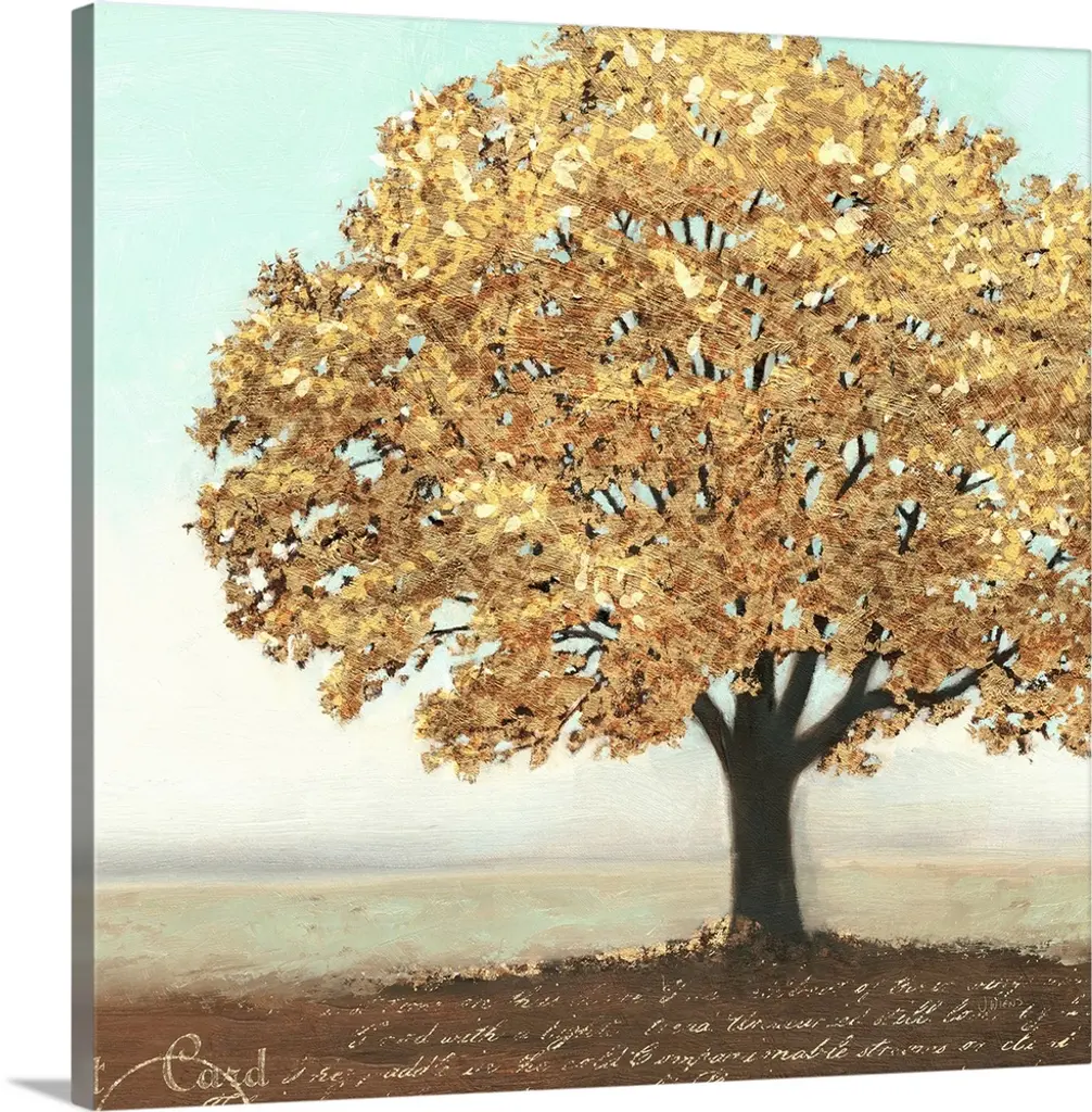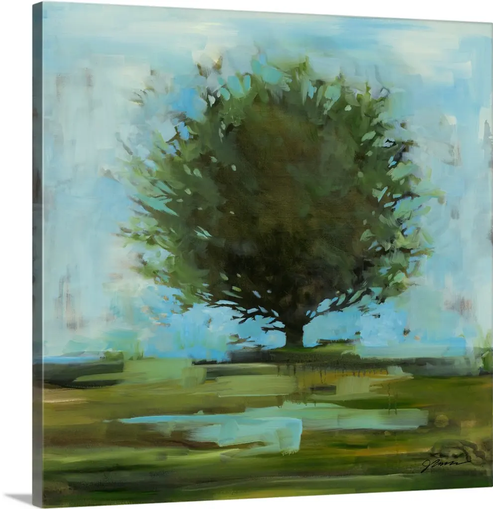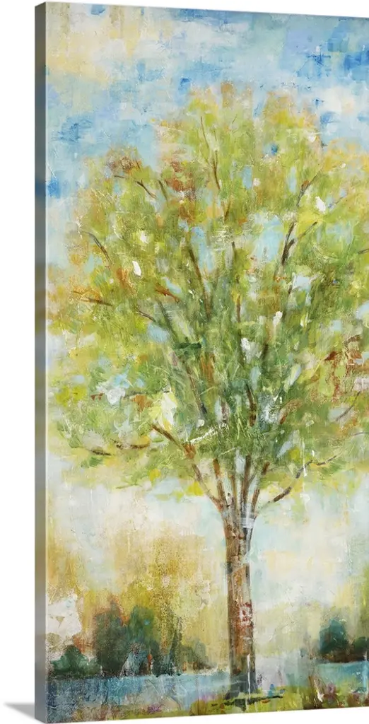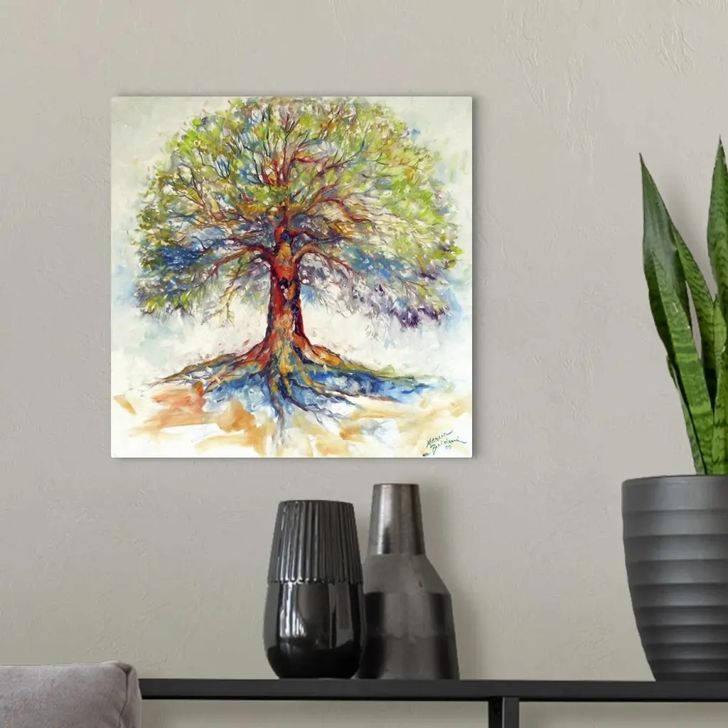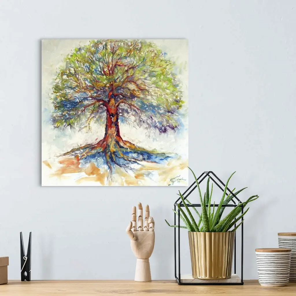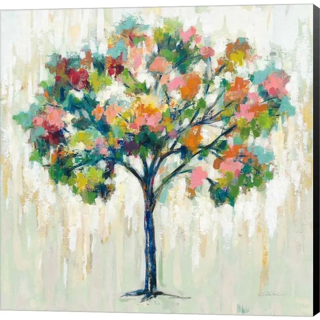 Square painting of a bold and colorful tree on a white background with faint blue, green, and orange hues.