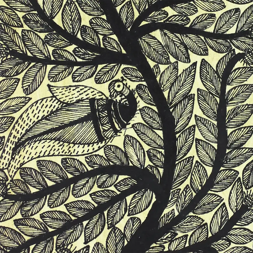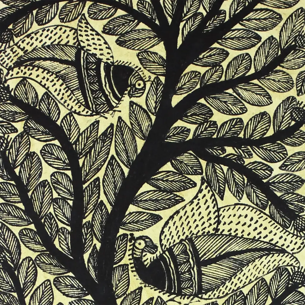 Peacocks nest on the sturdy branches of this tree of life that grows tall toward the heavens. Painted in black over handmade paper with vegetable dyes and acrylics, this composition is by Devendra Kumar Jha and Family. They diligently preserve this ancient art form originating in Bihar where Madhubani paintings were done by women on the walls and floors of their homes.Part of a limited edition. However, since this composition is painted free-hand, each painting will be unique.