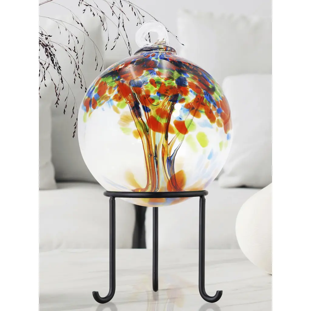 At Dale Tiffany, we strive to keep abreast of the latest home décor trends. As a result, we are pleased to present our Tree of Life Collection. The collection features an impressive array of Hand Blown Art Glass Ornaments in a variety of sizes and colors to suit every taste and décor. They are an effortless way to add a splash of color to any home, inside and out. Each Ornament is painstakingly hand blown using Favrile Art Glass. Each Ornament includes a clear glass loop at its top to facilitate hanging in any of the available stands, hangers, and garden stakes. Our hand blown process embeds color within the glass itself, which means that no 2 pieces are exactly alike and ensures yours are a dazzling one of a kind 3-dimensional art piece you will proudly display in your home or garden for many years to come. Due to the nature of handcrafted art glass, colors, sizes and patterns may vary slightly. (Stand or Metal Hanger Not Included)"Royal": a fantastic abstract tree of life design in brilliant shades of red, blue, amber, and green on a clear glass background. Also available in 4“, and 8“ diameters.
