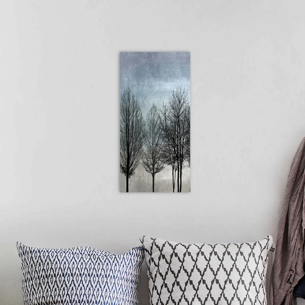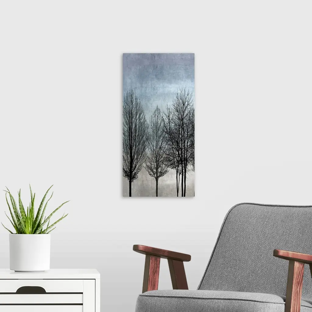 Decorative artwork featuring a black silhouette of leafless trees over a distressed background.