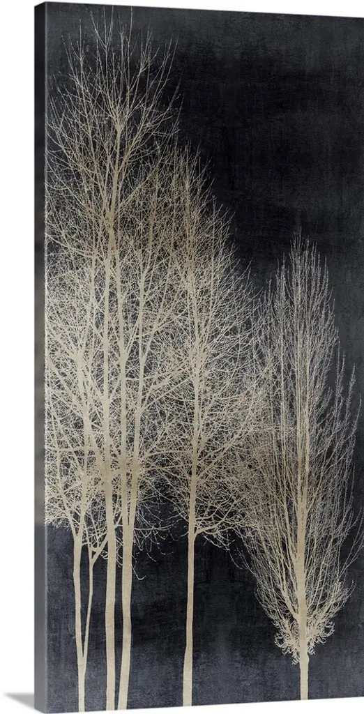 Decorative artwork featuring a black silhouette of leafless trees over a distressed background.