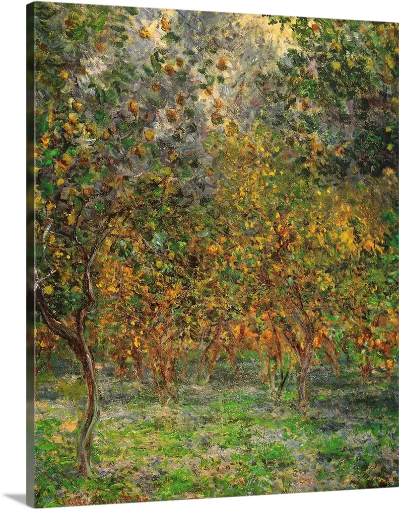 During the last several years of his life, Vincent van Gogh (1853-90) produced a series of sous-bois—literally, "undergrowth"—paintings depicting how the light filtered through tree branches at different times of day and year. This giclée reproduction on canvas captures his distinctive brushwork and arrives framed in gold and ready to hang.