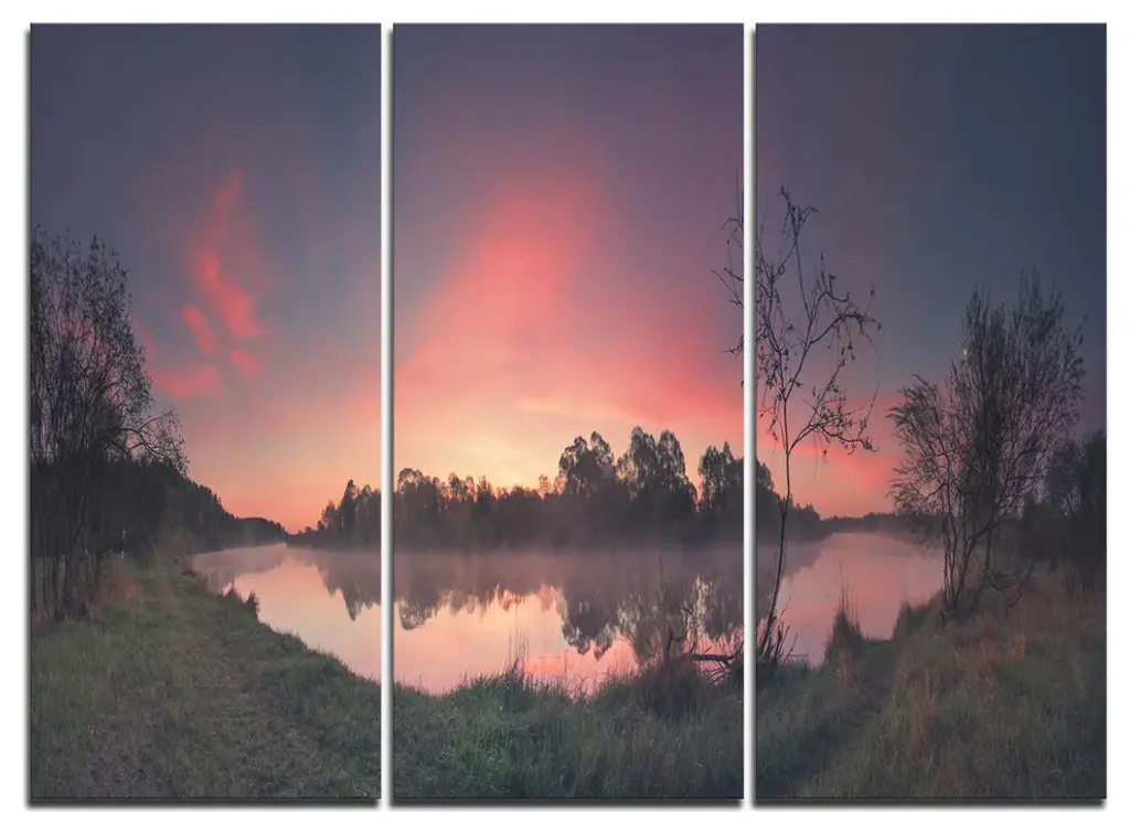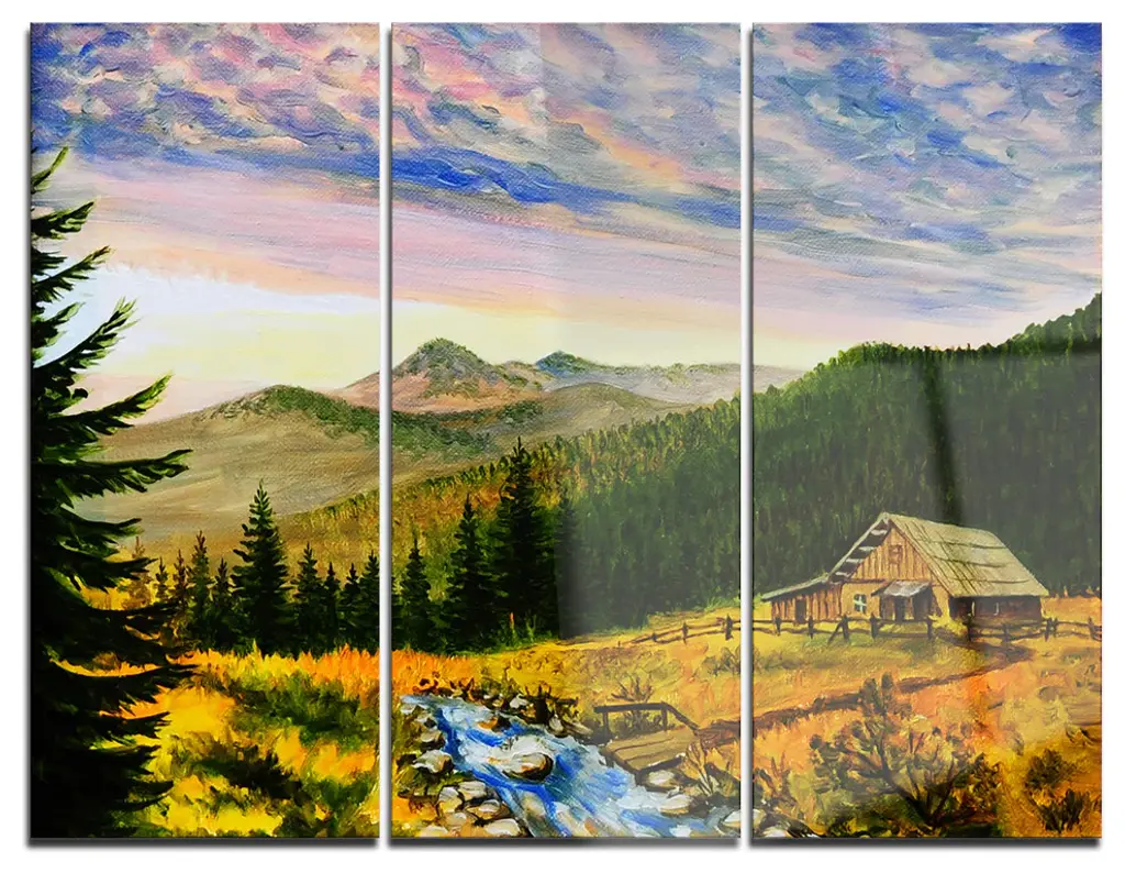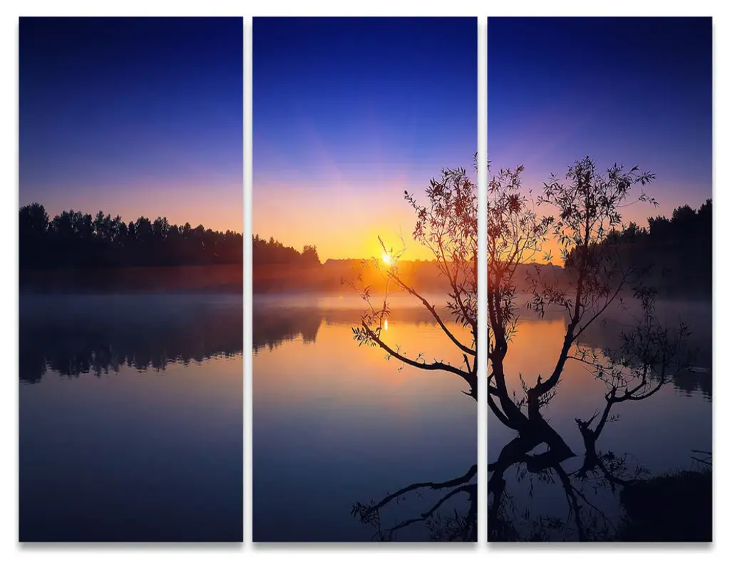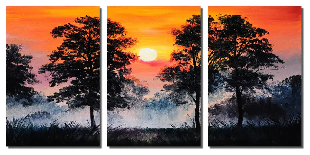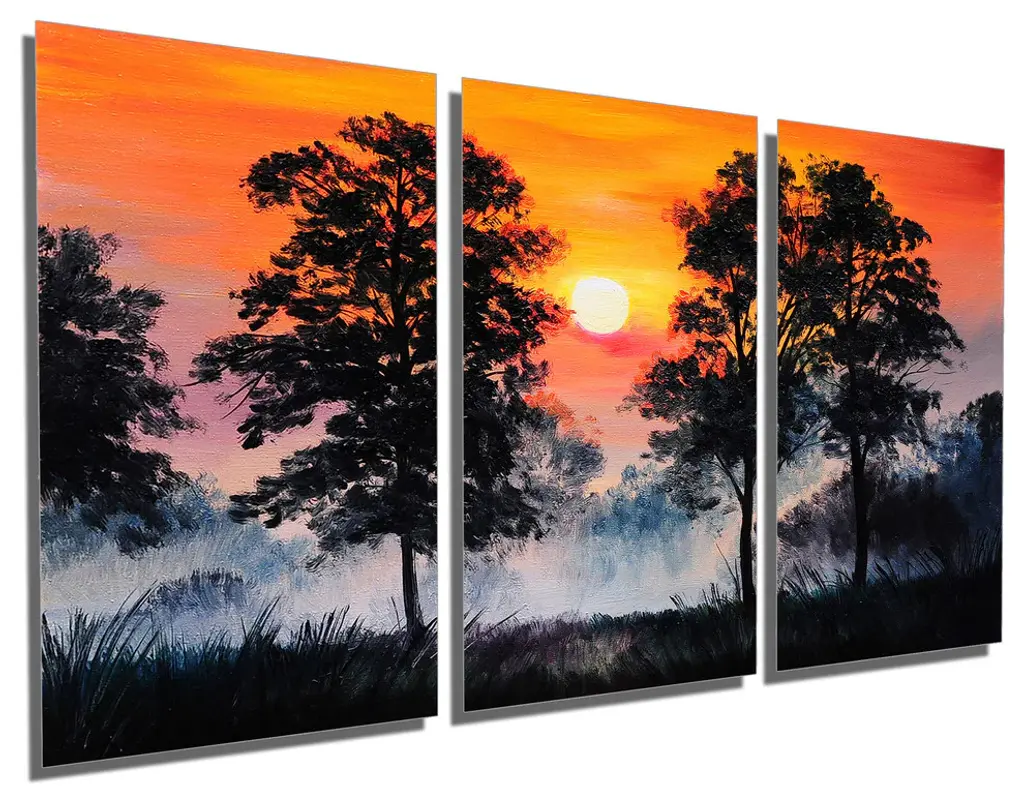 48"œ x 24"œ total size. Ready To Hang! (3 pieces - 16"œ x 24"œ each). 3 Panel Split (Triptych) Metal Print of Trees at sunset with digital painting effect. Modern metal wall art for home or office wall decor & interior design. Printed on Luxurious, HD aluminum glossy metal panels. Multi panel art.. HD aluminum panels. Metal print wall art. Includes Shadow Wall Mount on the back.• Aluminum Metal Wall Art• Made in USA• Ready to hang - No assembly required• Shadow mount hardware on the back• 0.045"œ thick HD Aluminum Panels• Scratch resistant, glossy finish• Superb color clarity, luxurious prints• Epson printing process• For indoor or moisture rich environment use• Easy to clean. Gently wipe with microfiber cloth.