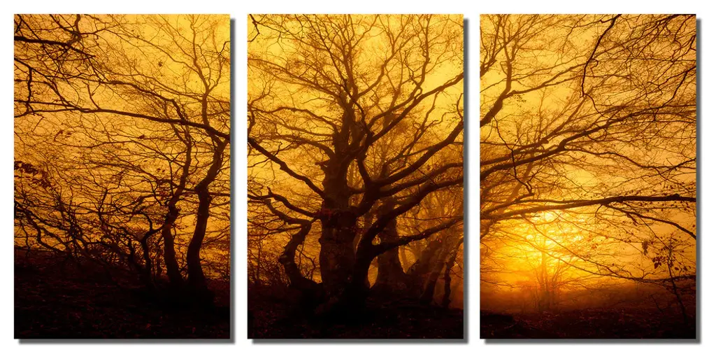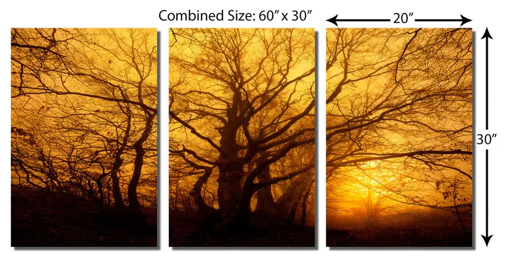 60"œ x 30"œ total size. Ready To Hang! (3 pieces - 20"œ x 30"œ each). 3 Panel Split (Triptych) Metal Print showing Trees in the mist, at dawn. Modern metal wall art for home or office wall decor & interior design. Printed on Luxurious, HD aluminum glossy metal panels. Multi panel art.. HD aluminum panels. Metal print wall art. Includes Shadow Wall Mount on the back.• Aluminum Metal Wall Art• Made in USA• Ready to hang - No assembly required• Shadow mount hardware on the back• 0.045"œ thick HD Aluminum Panels• Scratch resistant, glossy finish• Superb color clarity, luxurious prints• Epson printing process• For indoor or moisture rich environment use• Easy to clean. Gently wipe with microfiber cloth.