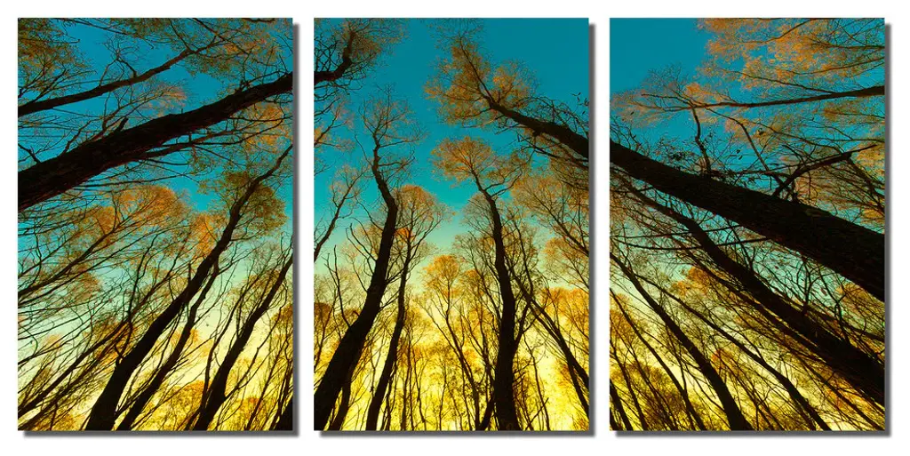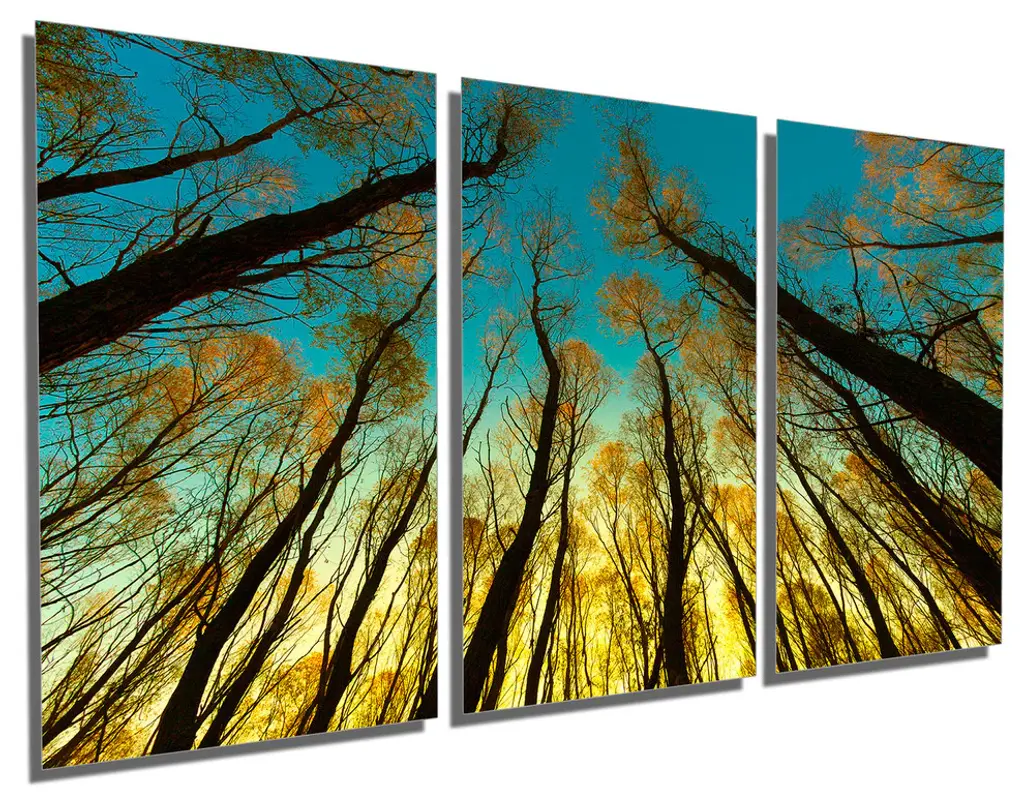 48"œ x 24"œ total size. Ready To Hang! (3 pieces - 16"œ x 24"œ each). 3 Panel Split (Triptych) Metal Print featuring upshot of Trees in forest. Modern metal wall art for home or office wall decor & interior design. Printed on Luxurious, HD aluminum glossy metal panels. Multi panel art.. HD aluminum panels. Metal print wall art. Includes Shadow Wall Mount on the back.• Aluminum Metal Wall Art• Made in USA• Ready to hang - No assembly required• Shadow mount hardware on the back• 0.045"œ thick HD Aluminum Panels• Scratch resistant, glossy finish• Superb color clarity, luxurious prints• Epson printing process• For indoor or moisture rich environment use• Easy to clean. Gently wipe with microfiber cloth.