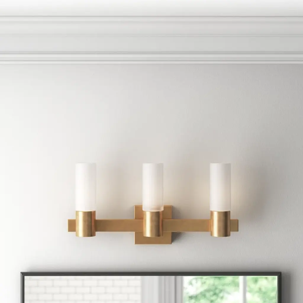 This vanity light takes a modern approach to a classic traditional style. The frame is made from metal with a rich aged brass finish and features a sleek support arm mounted on a square backplate. Three frosted cylindrical glass shades provide soft diffused light while adding a curated touch we love. Inside each shade, this hardwired vanity light accommodates three 40W candelabra-based bulbs. Best of all, it's endlessly versatile: It features reversible mounting, dimmer switch compatibility, and a damp location rating that's ideal for covered porches or steamy bathrooms.