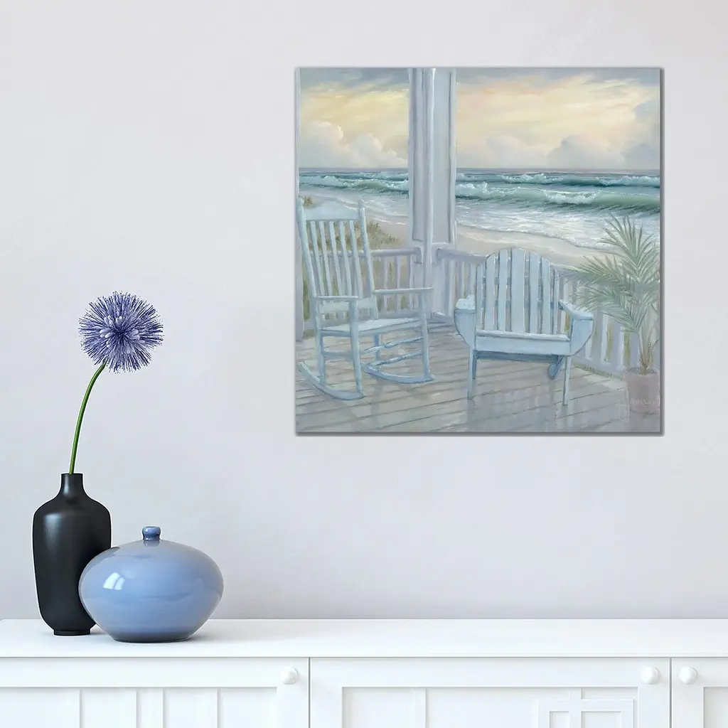 "Coastal Porch II" is by Artisan Georgia Janisse. Just set a while; relax and enjoy yourself. Our products are proudly made by skilled American workers. The surface of our framed art is textured with a fade resistant coating, so no glass is necessary. A vegetable-based glue is used in the production of our products, and our frames are crafted from 100% recycled material, in keeping with our environmentally friendly approach toward manufacturing. Arrives ready to hang. Crafted with utmost care and precision by skilled American crafters, this artwork is a testament to their unwavering commitment to quality. Each brushstroke exudes passion and dedication, bringing the scene to life in vivid detail. The fade-resistant texture coating ensures that the vibrant colors will remain intact, preserving the canvas-like appearance for years to come. Investing in a piece that is truly one-of-a-kind. No other artwork can capture the same blend of tranquility, elegance, and wanderlust. It is a testament to your discerning taste and appreciation for the beauty that nature and art can conjure together. Brought to you by Continents Apart.