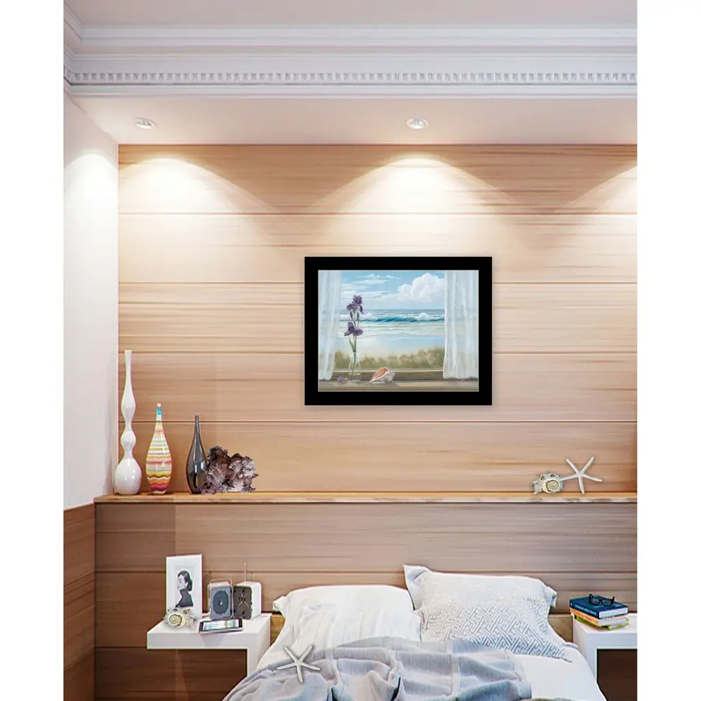 "Irises on Windowsill" is by Artisan Georgia Janisse. View the Ocean through the window pane and just relax . Our products are proudly made by skilled American workers. The surface of our framed art is textured with a fade resistant coating, so no glass is necessary. A vegetable-based glue is used in the production of our products, and our frames are crafted from 100% recycled material, in keeping with our environmentally friendly approach toward manufacturing. Arrives ready to hang. Crafted with utmost care and precision by skilled American crafters, this artwork is a testament to their unwavering commitment to quality. Each brushstroke exudes passion and dedication, bringing the scene to life in vivid detail. The fade-resistant texture coating ensures that the vibrant colors will remain intact, preserving the canvas-like appearance for years to come. Investing in a piece that is truly one-of-a-kind. No other artwork can capture the same blend of tranquility, elegance, and wanderlust. It is a testament to your discerning taste and appreciation for the beauty that nature and art can conjure together. Brought to you by Continents Apart.