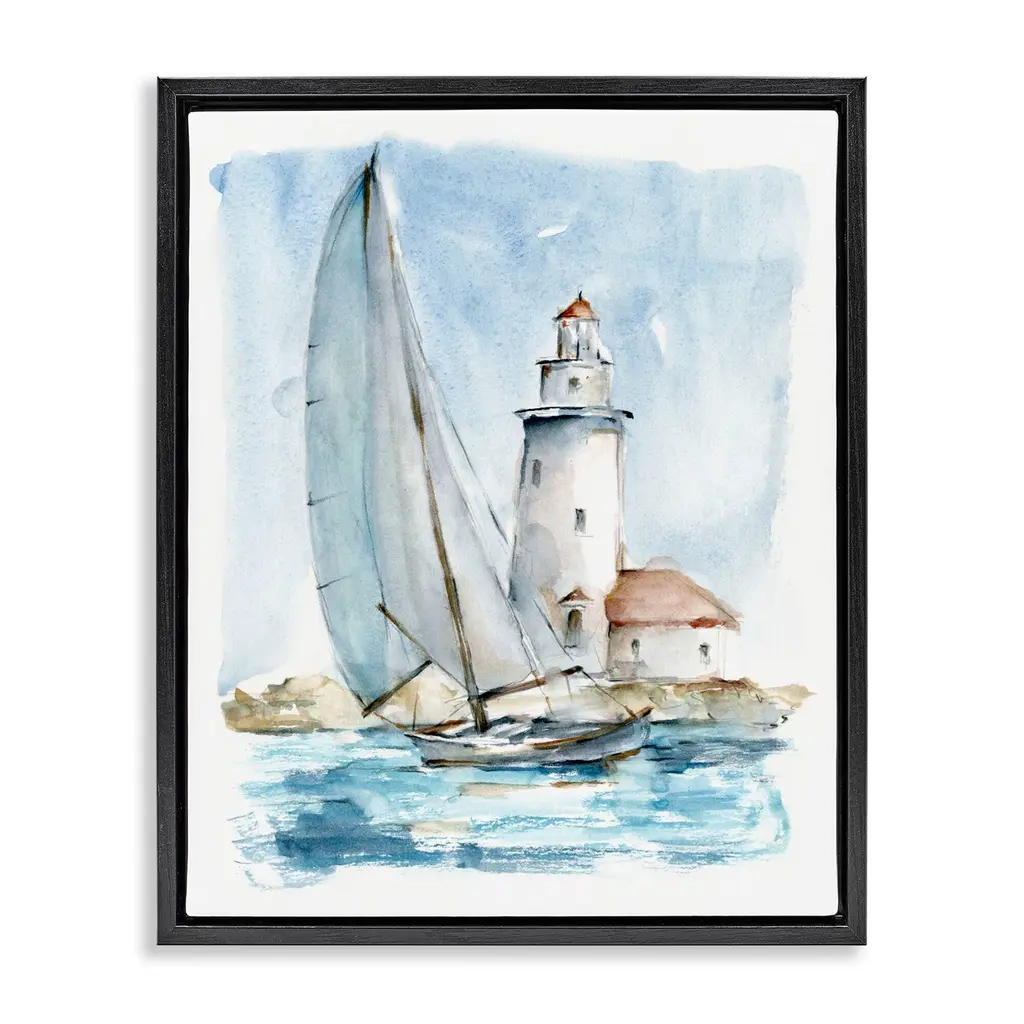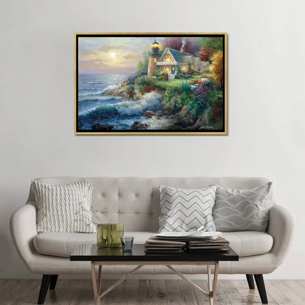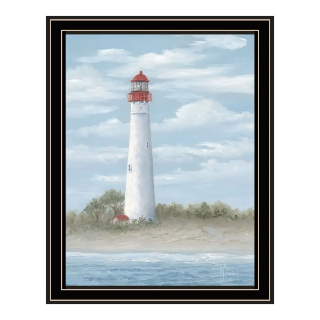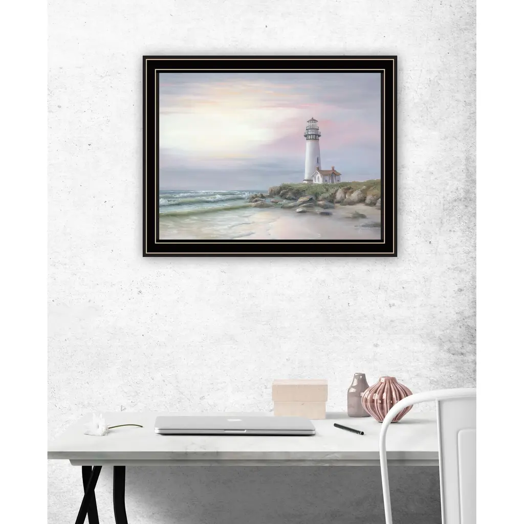 "Lighthouse at Sunset" is by Artisan Georgia Janisse. This features a framed wall art. Relax by the ocean waves at sunset, viewing the lighthouse. Our products are proudly made by skilled American workers. The surface of our framed art is textured with a fade resistant coating, so no glass is necessary. A vegetable-based glue is used in the production of our products, and our frames are crafted from 100% recycled material, in keeping with our environmentally friendly approach toward manufacturing. Arrives ready to hang. Crafted with utmost care and precision by skilled American crafters, this artwork is a testament to their unwavering commitment to quality. Each brushstroke exudes passion and dedication, bringing the scene to life in vivid detail. The fade-resistant texture coating ensures that the vibrant colors will remain intact, preserving the canvas-like appearance for years to come. Investing in a piece that is truly one-of-a-kind. No other artwork can capture the same blend of tranquility, elegance, and wanderlust. It is a testament to your discerning taste and appreciation for the beauty that nature and art can conjure together. Brought to you by Continents Apart.
