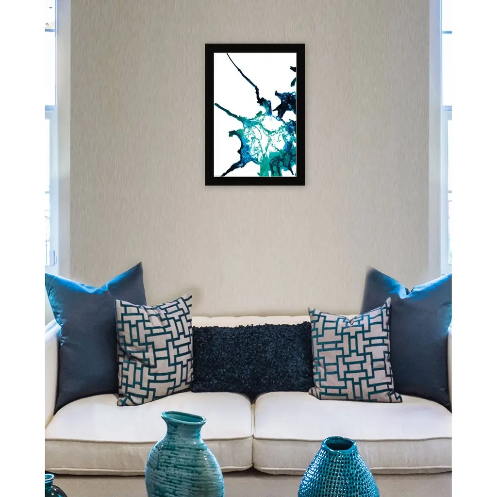 "Ocean Living 2" is by Artisan Kamdon Kreations. Impressions of the ocean; blue, black and white ink blots that lets your mind run wild about the ocean. Our products are proudly made by skilled American workers. The surface of our framed art is textured with a fade resistant coating, so no glass is necessary. A vegetable-based glue is used in the production of our products, and our frames are crafted from 100% recycled material, in keeping with our environmentally friendly approach toward manufacturing. Arrives ready to hang. Crafted with utmost care and precision by skilled American crafters, this artwork is a testament to their unwavering commitment to quality. Each brushstroke exudes passion and dedication, bringing the scene to life in vivid detail. The fade-resistant texture coating ensures that the vibrant colors will remain intact, preserving the canvas-like appearance for years to come. Investing in a piece that is truly one-of-a-kind. No other artwork can capture the same blend of tranquility, elegance, and wanderlust. It is a testament to your discerning taste and appreciation for the beauty that nature and art can conjure together. Brought to you by Continents Apart.