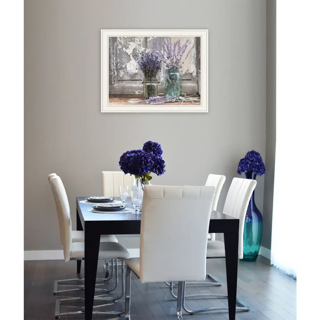 "Abundance of Beauty" by artist Lori Deiter. This decorative framed print 23"x19" of a primitive country farm door with paint peeling and jars of lavender. Prints are UV coated (glass is not needed) and arrives ready to hang.