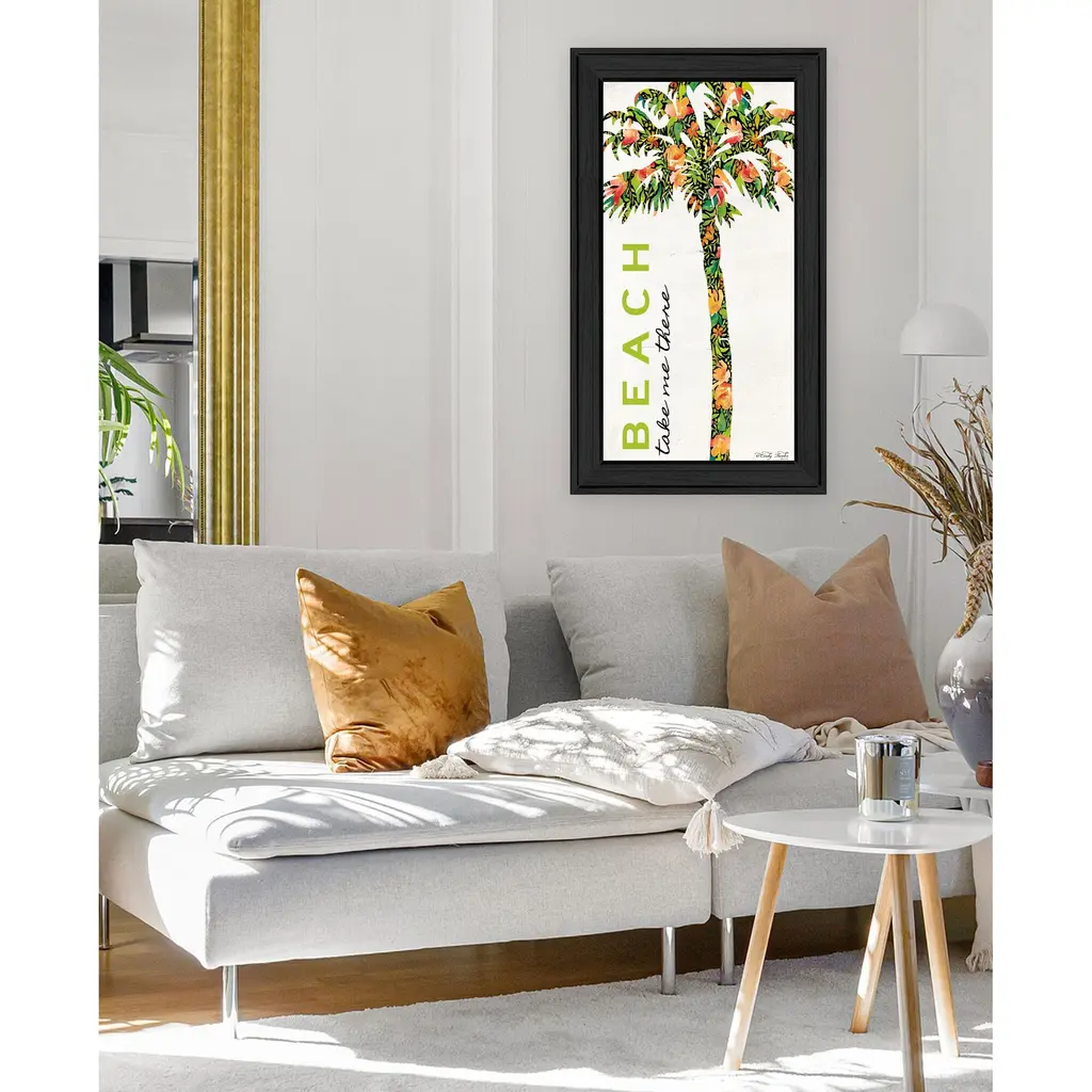 "Beach, Take Me There" is by Artisan Cindy Jacobs. A framed art piece of a Palm tree having a matrix of colors: yellow, oranges, greens and script saying: Beach Take Me There! What a cheery mix of color for any room in your beach home. Our products are proudly made by skilled American workers. The surface of our framed art is textured with a fade resistant coating, so no glass is necessary. A vegetable-based glue is used in the production of our products, and our frames are crafted from 100% recycled material, in keeping with our environmentally friendly approach toward manufacturing. Arrives ready to hang. Crafted with utmost care and precision by skilled American crafters, this artwork is a testament to their unwavering commitment to quality. Each brushstroke exudes passion and dedication, bringing the scene to life in vivid detail. The fade-resistant texture coating ensures that the vibrant colors will remain intact, preserving the canvas-like appearance for years to come. Investing in a piece that is truly one-of-a-kind. No other artwork can capture the same blend of tranquility, elegance, and wanderlust. It is a testament to your discerning taste and appreciation for the beauty that nature and art can conjure together. Brought to you by Continents Apart.