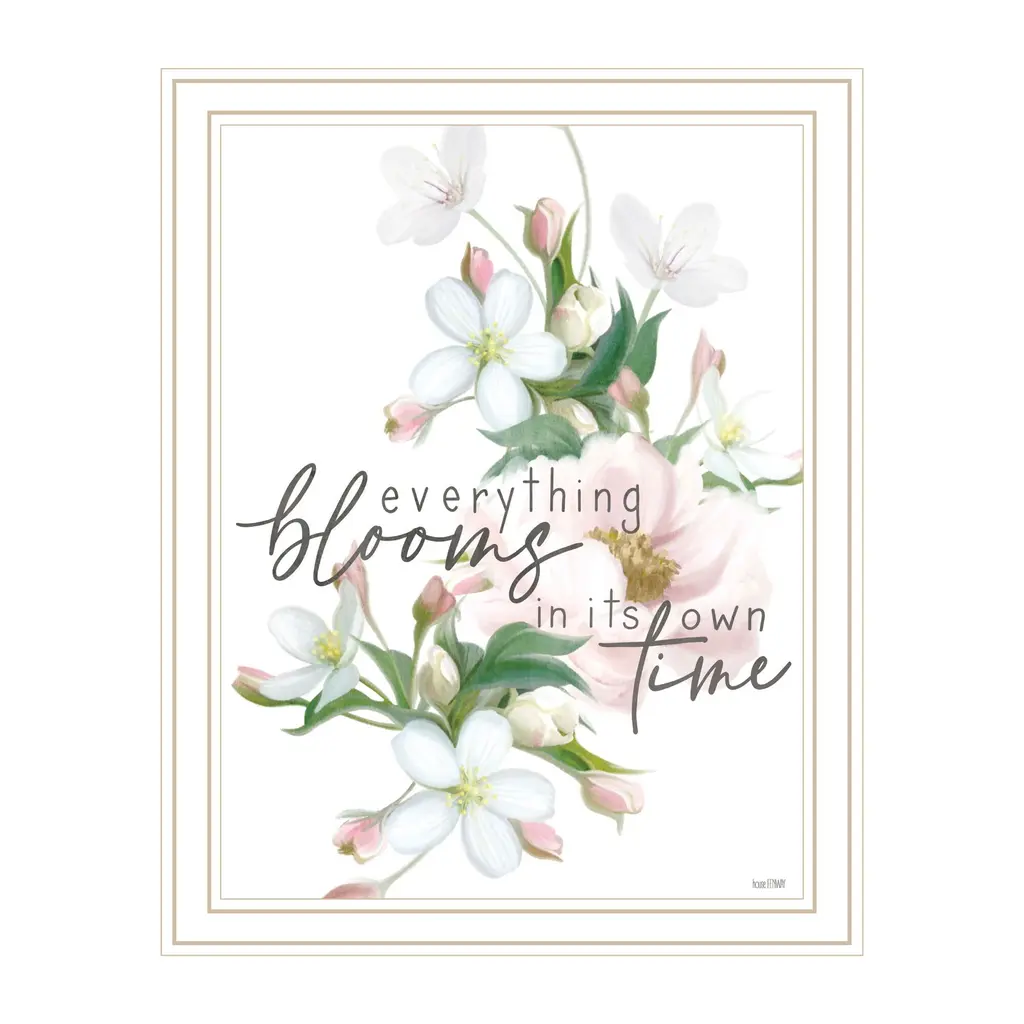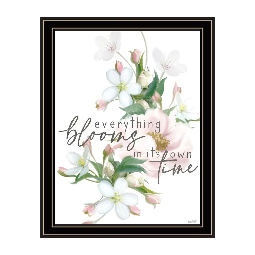 "Everything Bloom" is by Artisan This House Fenway. A beautiful light pink and white flower arrangement with a script overlay reading "Everything blooms in its own time". Our products are proudly made by skilled American workers. The surface of our framed art is textured with a fade resistant coating, so no glass is necessary. A vegetable-based glue is used in the production of our products, and our frames are crafted from 100% recycled material, in keeping with our environmentally friendly approach toward manufacturing. Arrives ready to hang. Crafted with utmost care and precision by skilled American crafters, this artwork is a testament to their unwavering commitment to quality. Each brushstroke exudes passion and dedication, bringing the scene to life in vivid detail. The fade-resistant texture coating ensures that the vibrant colors will remain intact, preserving the canvas-like appearance for years to come. Investing in a piece that is truly one-of-a-kind. No other artwork can capture the same blend of tranquility, elegance, and wanderlust. It is a testament to your discerning taste and appreciation for the beauty that nature and art can conjure together. Brought to you by Continents Apart.