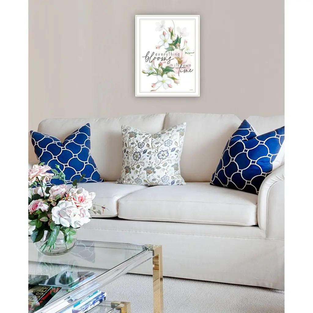 "Everything Bloom" is by Artisan This House Fenway. A beautiful light pink and white flower arrangement with a script overlay reading "Everything blooms in its own time". Our products are proudly made by skilled American workers. The surface of our framed art is textured with a fade resistant coating, so no glass is necessary. A vegetable-based glue is used in the production of our products, and our frames are crafted from 100% recycled material, in keeping with our environmentally friendly approach toward manufacturing. Arrives ready to hang. Crafted with utmost care and precision by skilled American crafters, this artwork is a testament to their unwavering commitment to quality. Each brushstroke exudes passion and dedication, bringing the scene to life in vivid detail. The fade-resistant texture coating ensures that the vibrant colors will remain intact, preserving the canvas-like appearance for years to come. Investing in a piece that is truly one-of-a-kind. No other artwork can capture the same blend of tranquility, elegance, and wanderlust. It is a testament to your discerning taste and appreciation for the beauty that nature and art can conjure together. Brought to you by Continents Apart.