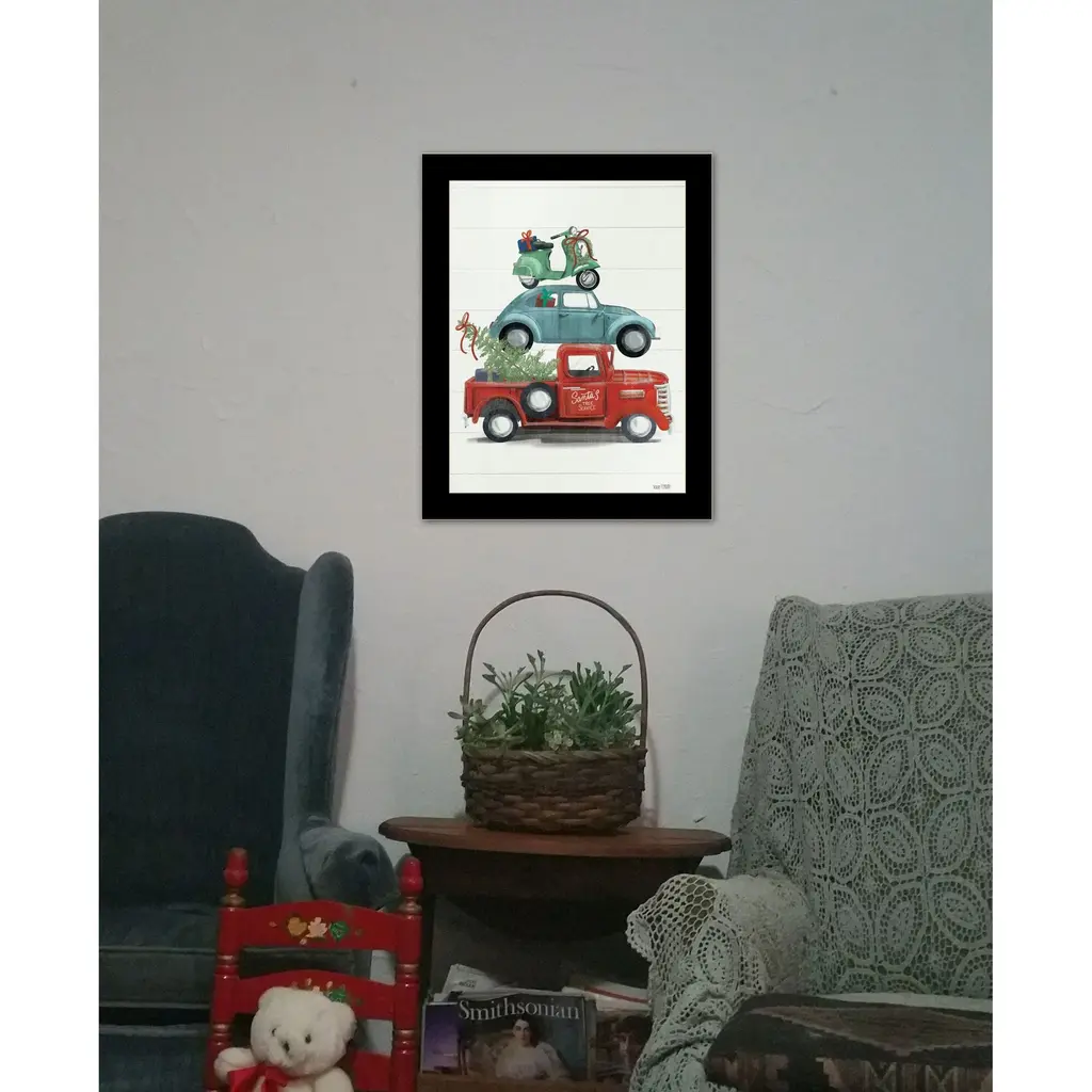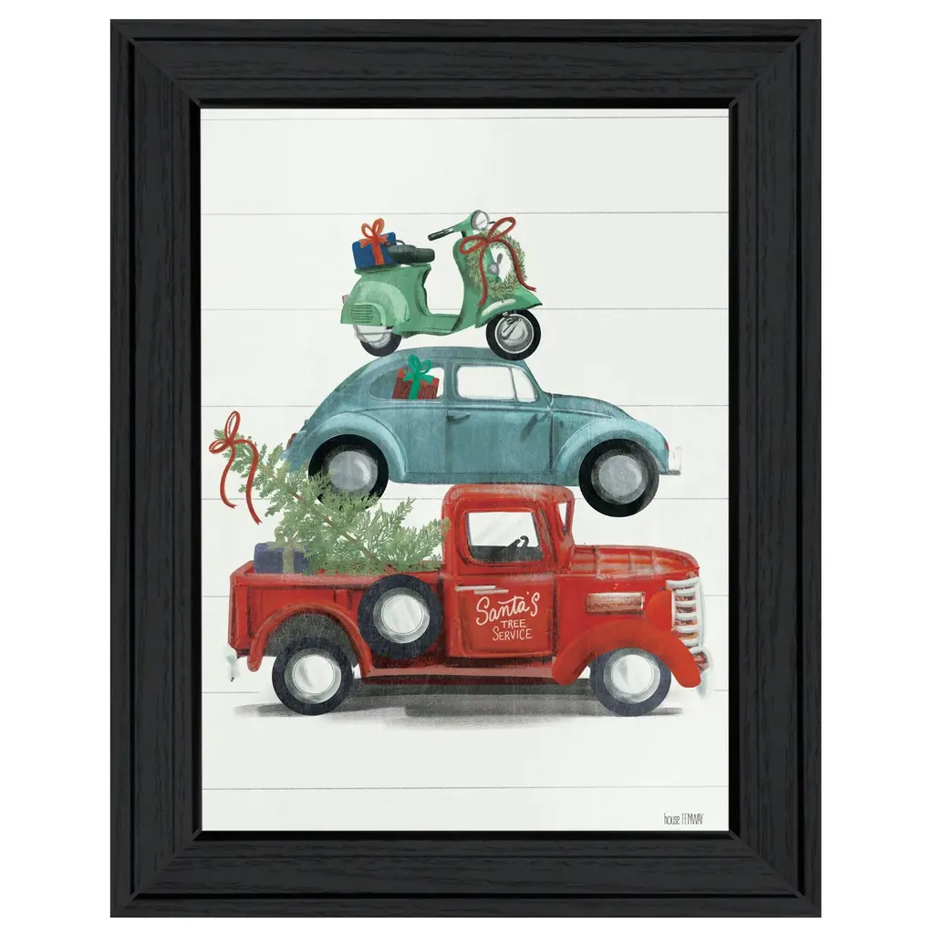 "Holiday Travels" is by Artisan House Fenway. Perfect holiday image for any location. Vintage truck resting on the bottom of the image with a blue vintage car resting on top of that and a scooter all decorated in their Christmas best. Our products are proudly made by skilled American workers. The surface of our framed art is textured with a fade resistant coating, so no glass is necessary. A vegetable-based glue is used in the production of our products, and our frames are crafted from 100% recycled material, in keeping with our environmentally friendly approach toward manufacturing. Arrives ready to hang. Crafted with utmost care and precision by skilled American crafters, this artwork is a testament to their unwavering commitment to quality. Each brushstroke exudes passion and dedication, bringing the scene to life in vivid detail. The fade-resistant texture coating ensures that the vibrant colors will remain intact, preserving the canvas-like appearance for years to come. Investing in a piece that is truly one-of-a-kind. No other artwork can capture the same blend of tranquility, elegance, and wanderlust. It is a testament to your discerning taste and appreciation for the beauty that nature and art can conjure together. Brought to you by Continents Apart.