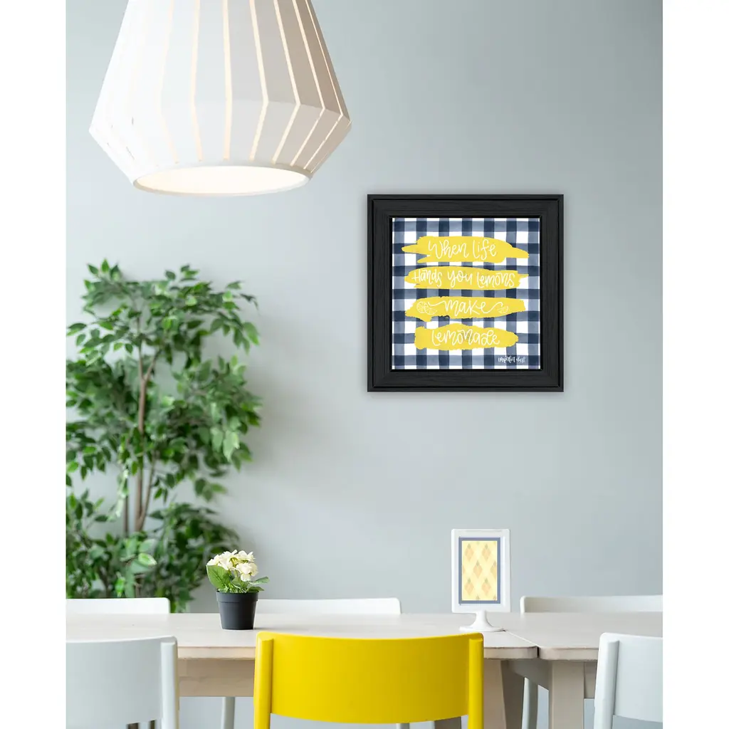 "Make Lemonade!" is by Artisan Imperfect Dust. A framed art of dark blue plaid with a lemon slice which states: You're My Main Squeeze! Our products are proudly made by skilled American workers. The surface of our framed art is textured with a fade resistant coating, so no glass is necessary. A vegetable-based glue is used in the production of our products, and our frames are crafted from 100% recycled material, in keeping with our environmentally friendly approach toward manufacturing. Arrives ready to hang. Crafted with utmost care and precision by skilled American crafters, this artwork is a testament to their unwavering commitment to quality. Each brushstroke exudes passion and dedication, bringing the scene to life in vivid detail. The fade-resistant texture coating ensures that the vibrant colors will remain intact, preserving the canvas-like appearance for years to come. Investing in a piece that is truly one-of-a-kind. No other artwork can capture the same blend of tranquility, elegance, and wanderlust. It is a testament to your discerning taste and appreciation for the beauty that nature and art can conjure together. Brought to you by Continents Apart.