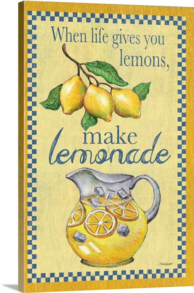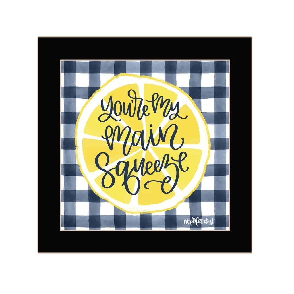 "Make Lemonade!" is by Artisan Imperfect Dust. A framed art of dark blue plaid with a lemon slice which states: You're My Main Squeeze! Our products are proudly made by skilled American workers. The surface of our framed art is textured with a fade resistant coating, so no glass is necessary. A vegetable-based glue is used in the production of our products, and our frames are crafted from 100% recycled material, in keeping with our environmentally friendly approach toward manufacturing. Arrives ready to hang. Crafted with utmost care and precision by skilled American crafters, this artwork is a testament to their unwavering commitment to quality. Each brushstroke exudes passion and dedication, bringing the scene to life in vivid detail. The fade-resistant texture coating ensures that the vibrant colors will remain intact, preserving the canvas-like appearance for years to come. Investing in a piece that is truly one-of-a-kind. No other artwork can capture the same blend of tranquility, elegance, and wanderlust. It is a testament to your discerning taste and appreciation for the beauty that nature and art can conjure together. Brought to you by Continents Apart.
