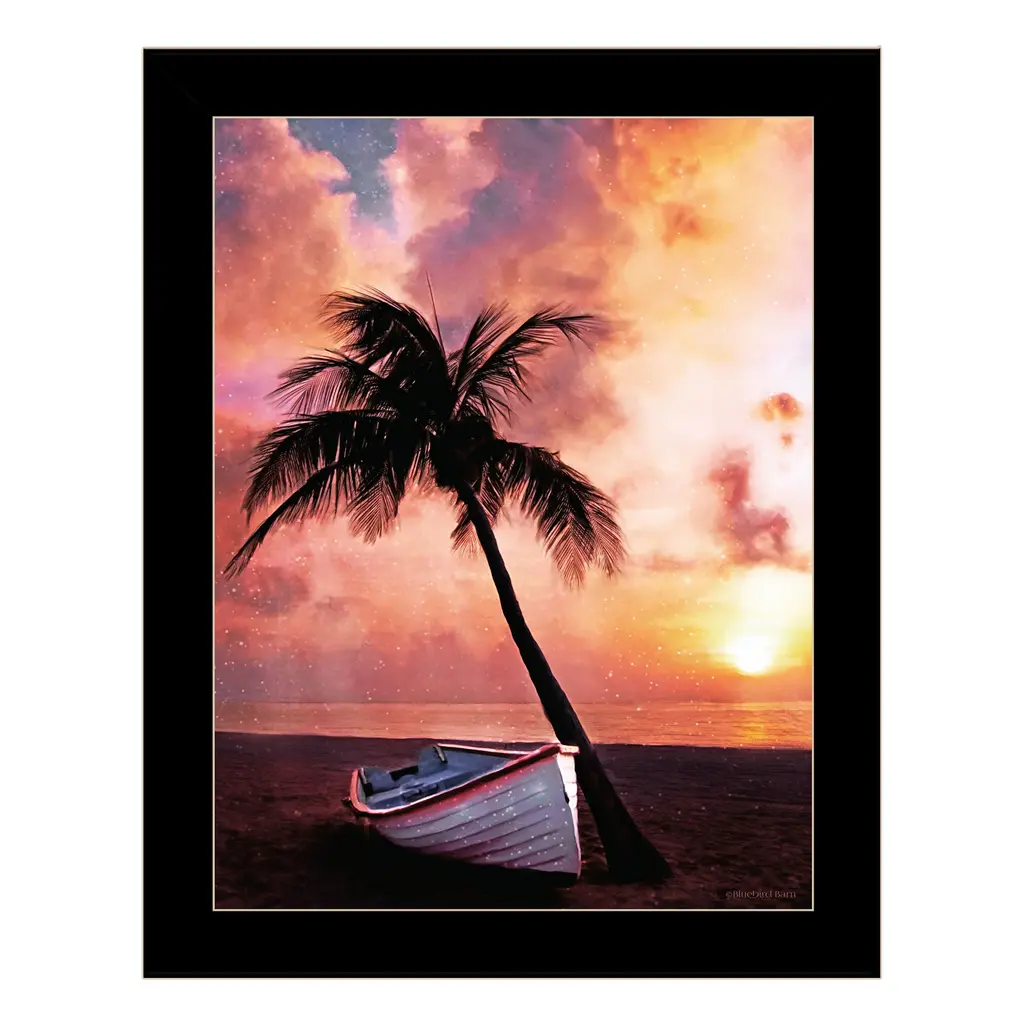 Palm Tree Sunset by artisan Bluebird Barn is a decorative framed print that showcases a breath taking sunset on a perfect calm beach. The rowboat resting against the palm tree waiting for you to take a ride. Crafted with utmost care and precision by skilled American crafters, this artwork is a testament to their unwavering commitment to quality. Each brushstroke exudes passion and dedication, bringing the scene to life in vivid detail. The fade-resistant texture coating ensures that the vibrant colors will remain intact, preserving the canvas-like appearance for years to come. Investing in a piece that is truly one-of-a-kind. No other artwork can capture the same blend of tranquility, elegance, and wanderlust. It is a testament to your discerning taste and appreciation for the beauty that nature and art can conjure together. Brought to you by Continents Apart.