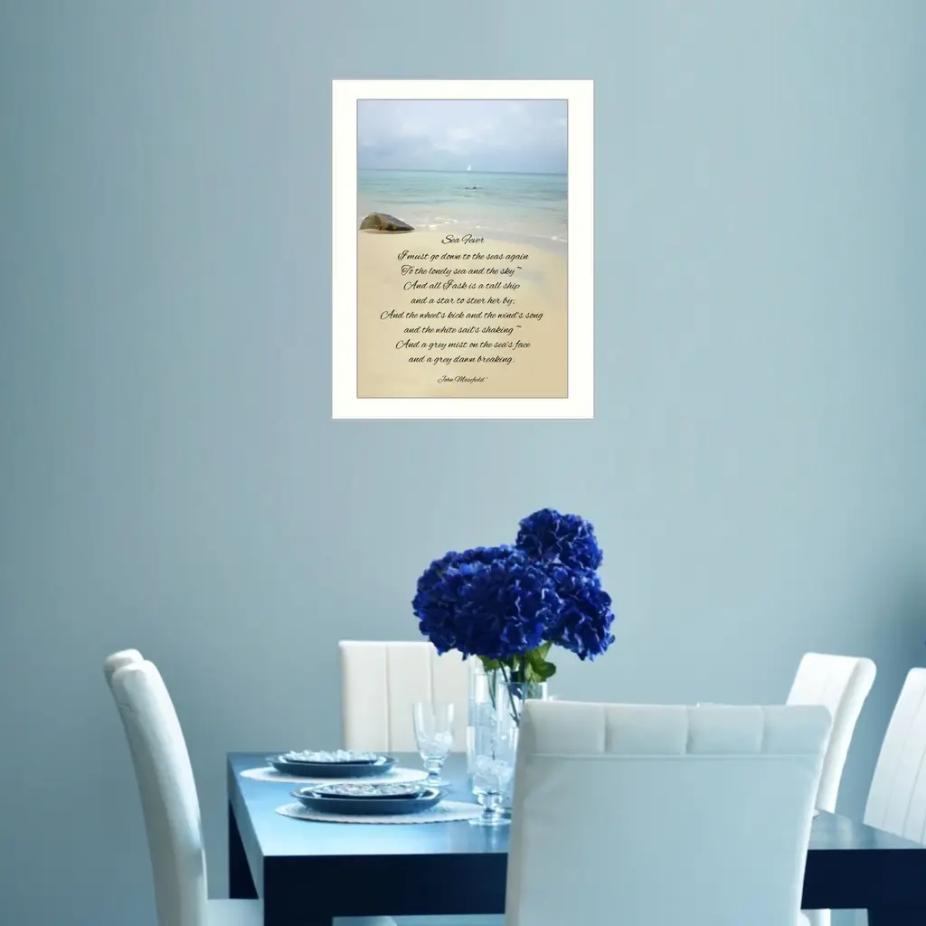 "Sea Fever" is a 10" x 14" framed print. This artwork features a beach scene with a sailboat off in the distance and a poem about sea fever. This totally American Made wall decor item features an attractive frame, a textured canvas like finish so no glass is necessary and is ready to hang.