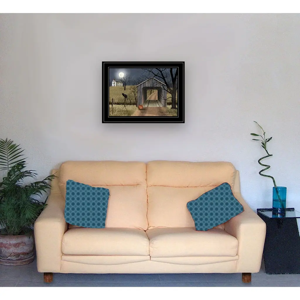 "Sleepy Hollow Bridge" by artisan Billy Jacobs. This decorative black framed print (19x15) of a covered bridge, black cat and pumpkin in the full moonlight brings you laughter. Enjoy the setting of the spooky tree limbs, take a chance and cross the covered bridge, down the dirt road. Crafted by skilled American crafters and coated with a fade-resistant texture, this piece has a canvas-like appearance that will last for years to come. Invest in a piece that is truly one-of-a-kind.