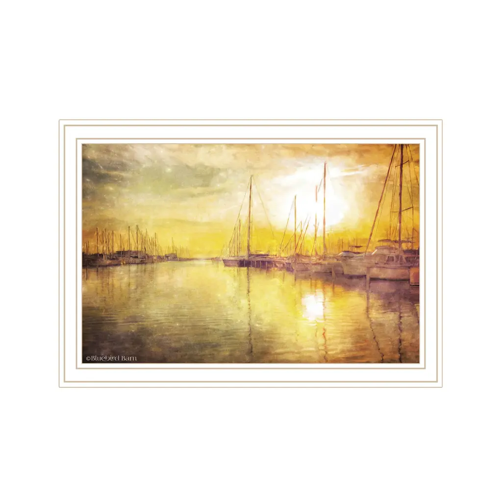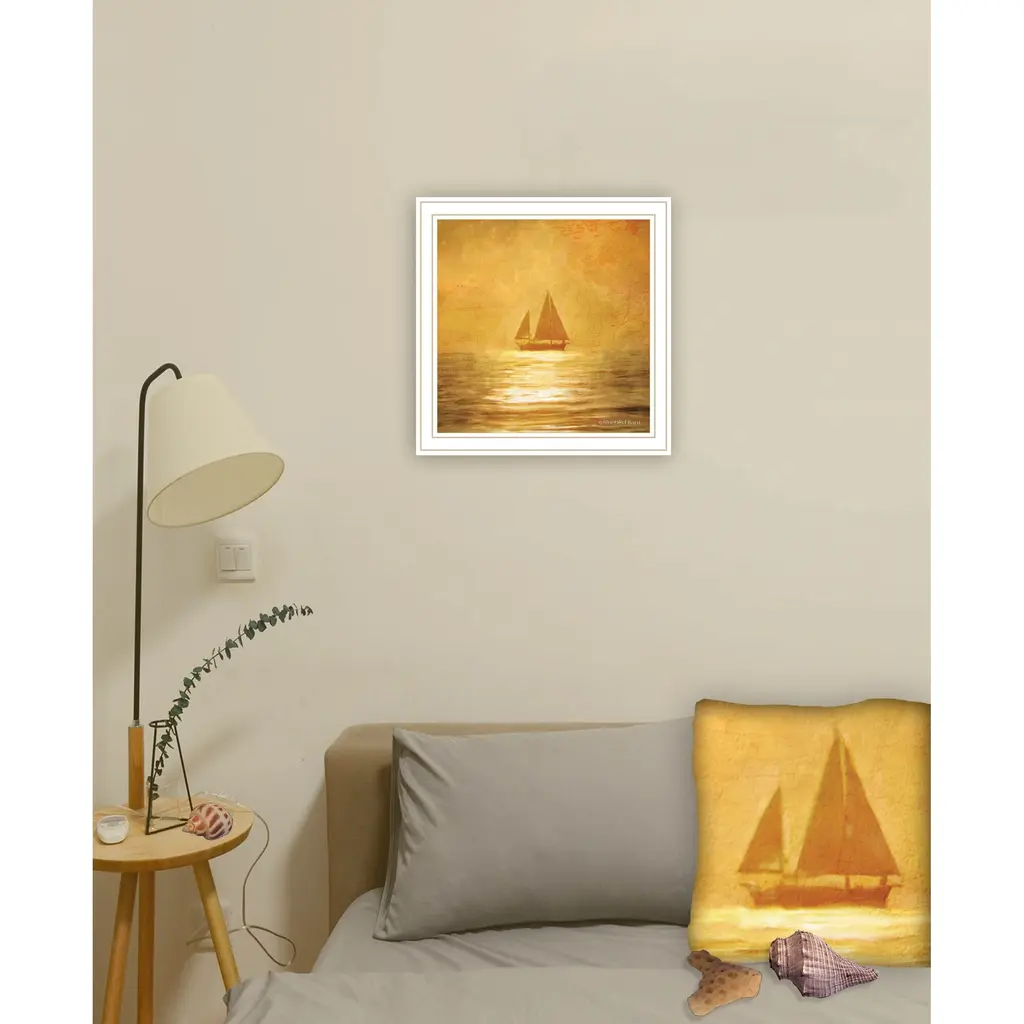 Trendydecor4u Contemporary "Solo Gold Sunset Sailboat" Framed Print Wall Art - White
